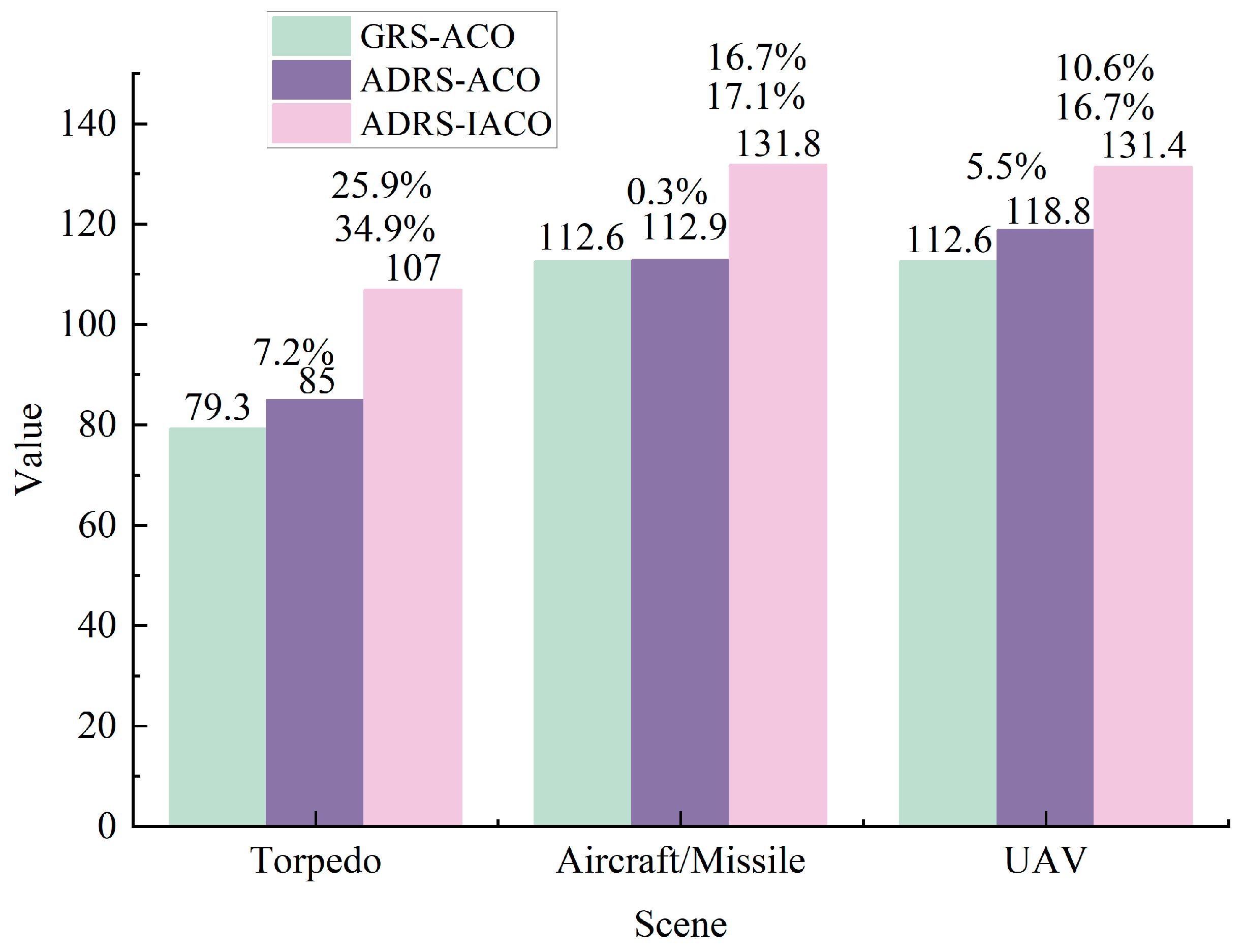 Average solution value. Representative results from Torpedo/10-set show a rise from 66.71 (GRS-ACO) to 72.55 (ADRS-ACO) and 73.40 (ADRS-IACO). The same ordering persists with 20 sets (Torpedo: 66.29 → 72.43 → 73.36) and in the Aircraft/Missile and UAV scenarios, confirming that ADRS contributes mission-aligned gains and that IACO further amplifies them.