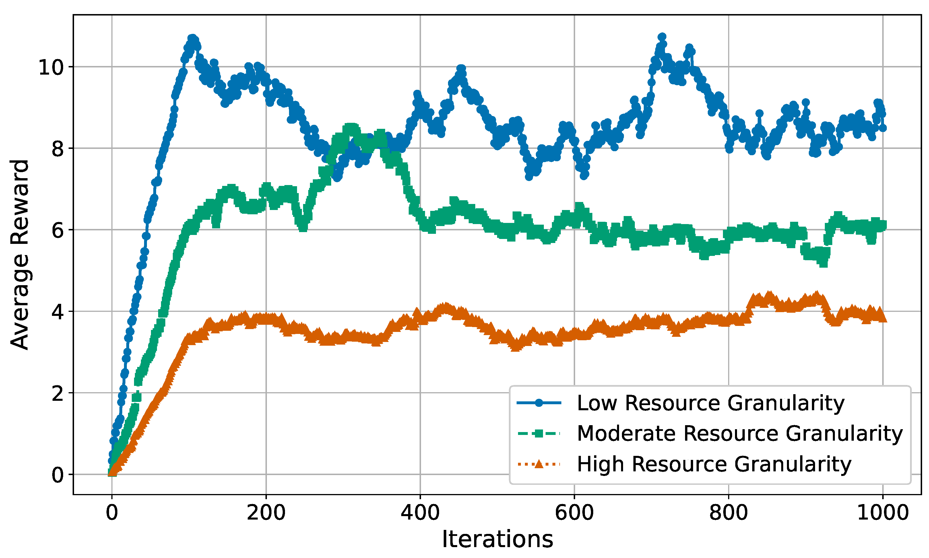 In the experiments performed initially, we evaluated the Q-Table-based Q-learning methodology. We assumed resources of different cost resource levels, (i) low resource granularity (three levels), (ii) moderate resource granularity (five levels), and high resource granularity (seven levels), while the task requests generated were associated with two intent levels. The training procedure was executed for more than 10,000 timesteps. The parameters of Bellman’s Equation were set to