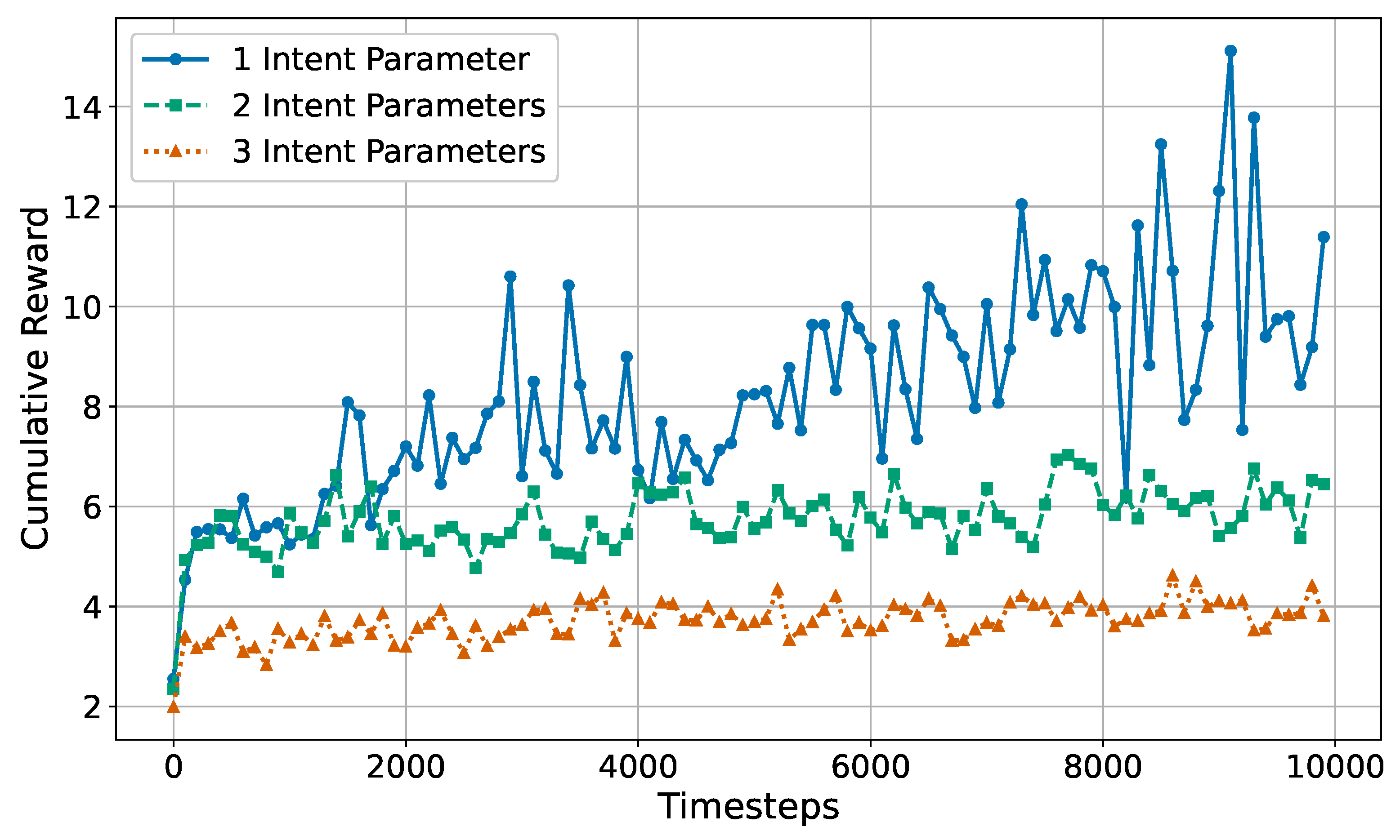 Figure 6). An increased number of different intents that a user provides in a single task request results in a smaller average reward and a more gradual increase in its value over time. This complexity stems from the increased difficulty in correlating an expanding set of intents with the actual, infrastructure-aware values of the respective resources’ parameters.