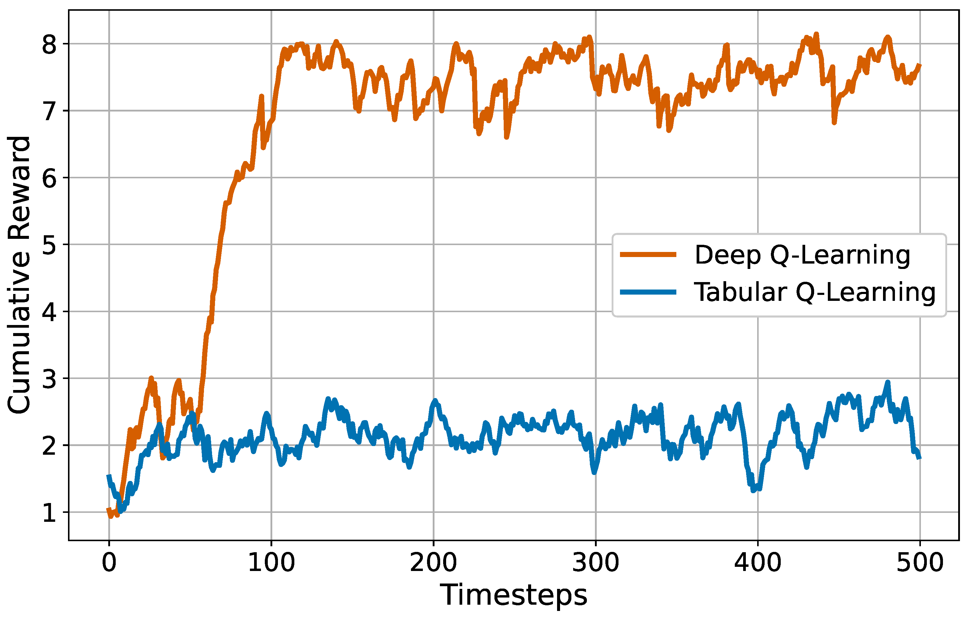 (Q-Table-based Q-learning) and Deep RL-DRL (Q-learning combined with a neural network) methodologies. In our experiments, reported in