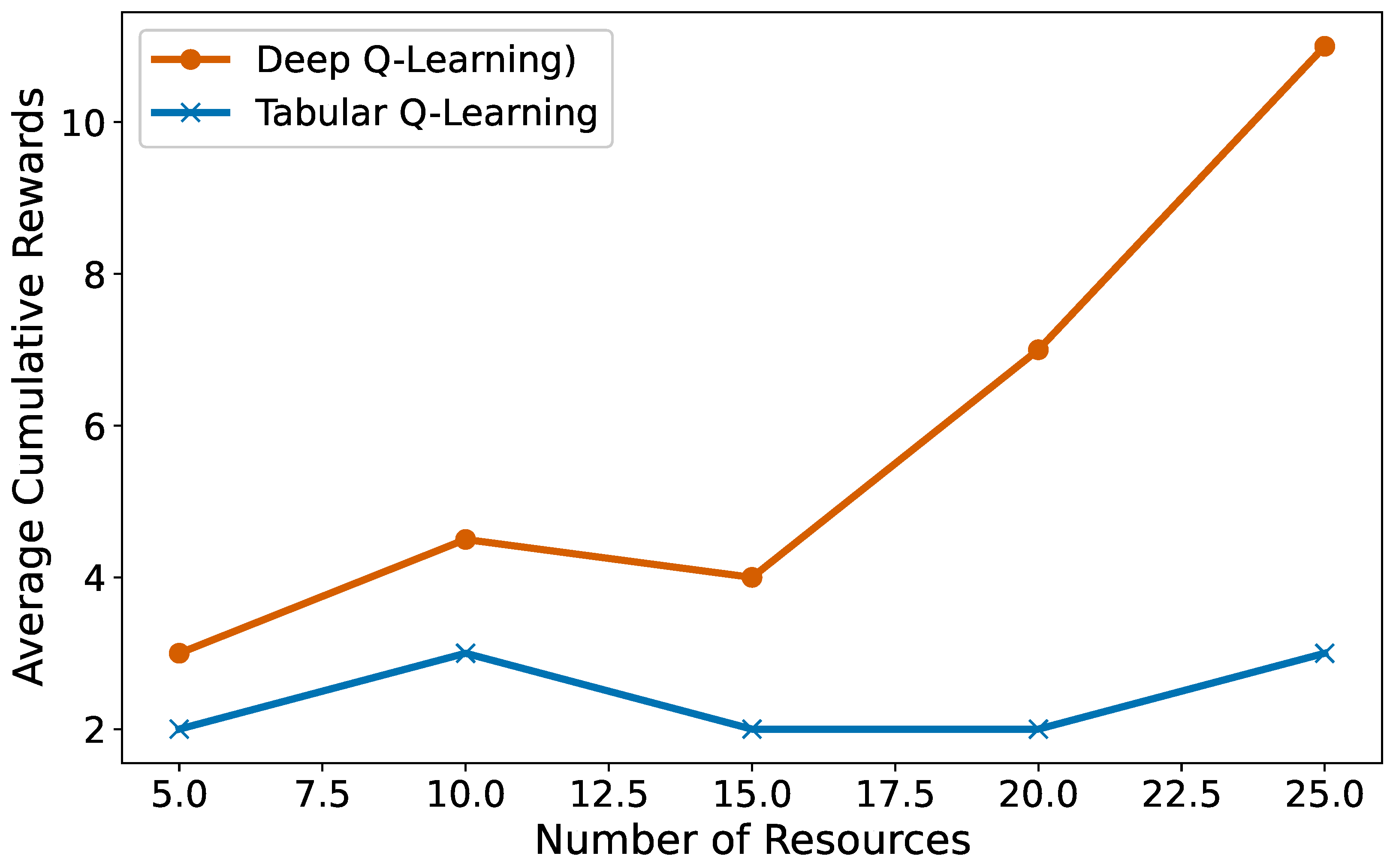 Figure 7, we initially assume an infrastructure with 25 resources, where both methodologies run for 500 episodes. Each episode comprises a sequence of states, actions, and rewards and concludes upon reaching a terminal state. As the figure illustrates, in the first 20 episodes, the two methodologies exhibit almost the same average cumulative rewards. After episode 100, the DRL methodology is more effective, yielding better rewards that are even five times higher. These results illustrate the effectiveness of using neural networks with Q-learning in order to identify a user’s intent. This is particularly important when the state and action space sizes are large, which is the case when we have many resources, resource and intent levels and tasks. Also, the Q-learning mechanism is computationally expensive since it requires a lot of memory to store the Q-values and a lot of time to fill the Q-Table in comparison to the deep Q-learning methodology that uses a neural network.