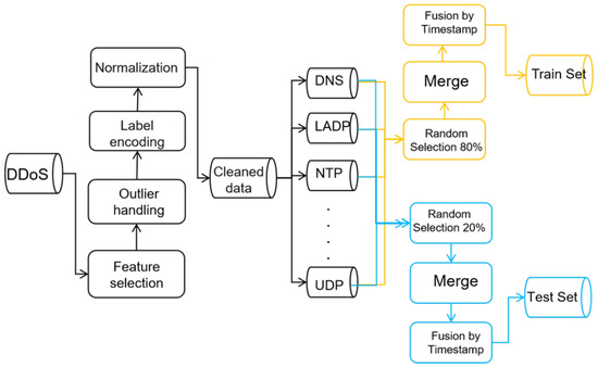 In order to effectively improve the detection performance of the model for DDoS attacks, the preprocessing and feature construction of the dataset is a crucial part of the foundation. Since the CIC-DDoS2019 dataset has obvious advantages in terms of the diversity of attack types and the rationality of experimental design, and can more comprehensively validate the model’s detection ability in complex network environments, we choose this dataset for experiments. In this section, we will introduce the preprocessing method and feature-construction process of this dataset in detail, as shown in Figure 1, to lay a solid foundation for the subsequent model training and performance evaluation.