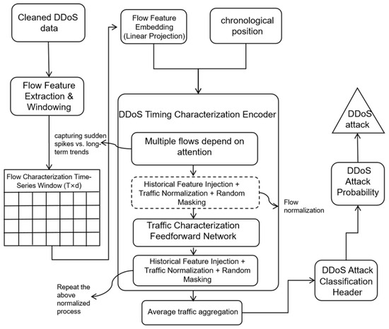Therefore, to address the suddenness of DDoS attacks in the time dimension and the variability in the feature dimension, attack detection methods based on the Transformer architecture can not only effectively model their complex behavioral patterns but also adapt to the needs of efficient inference and detection under high concurrency and large-scale network traffic. Based on the above considerations, this paper proposes a DDoS attack detection method based on the Transformer model, which aims to fully explore the temporal features and potential multidimensional dependencies in network traffic and improve the identification and detection capability of complex and diverse DDoS attacks. The overall architecture of the system is shown in Figure 2.