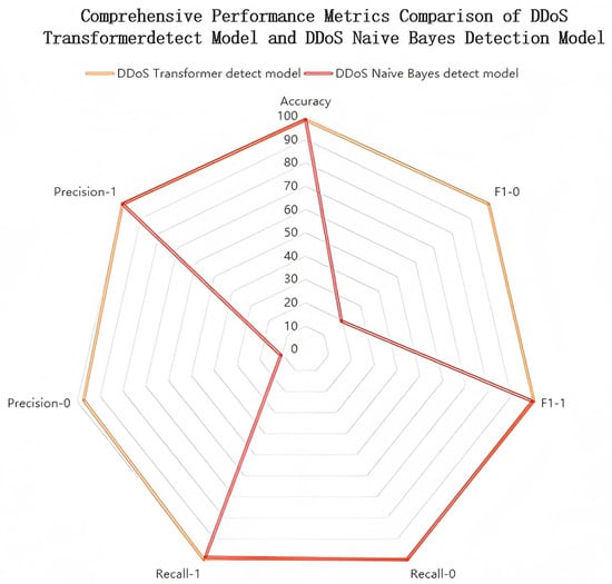 Radar chart comparing the combined performance metrics of the DDoS Transformer detection model and the DDoS Naive Bayes detection model.
