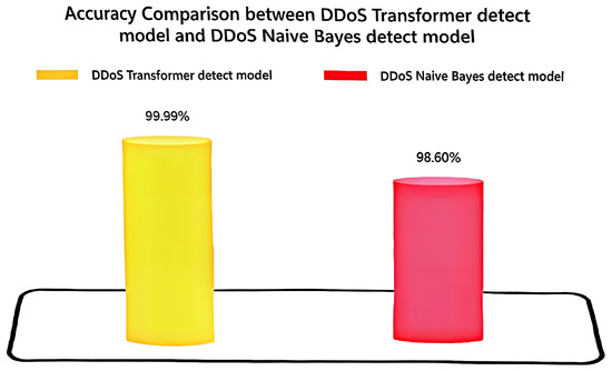 On the basis of the radar chart analysis of the multidimensional performance of the models, this paper further extracts the overall classification accuracies of the two models on the complete test set and draws histograms for comparative analysis to portray more intuitively their comprehensive discriminative abilities in large-scale traffic identification tasks. As shown in Figure 4, the Transformer model achieves 99.99% accuracy on the test samples, which almost reaches the theoretical upper limit, indicating that it still has a strong generalization ability and abnormal behavior identification ability when facing highly complex and dynamically changing network traffic. In contrast, the accuracy of the Naive Bayes model under the same data conditions is 98.60%, although the overall performance is impressive, but there is still a gap with Transformer. This gap suggests that the strong assumption of feature independence by Naive Bayes is weakly adapted to the highly coupled multidimensional features in DDoS attack traffic.