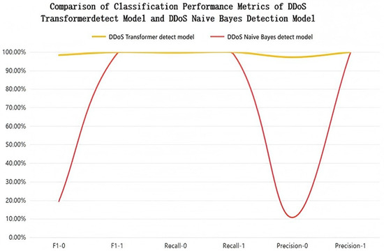 Comparison of classification performance metrics of DDoS Transformer detection model and DDoS Naive Bayes detection model graphs.
