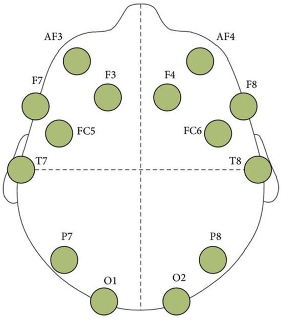 The study utilized the Simultaneous Task EEG Workload (STEW) dataset, an open access resource designed for research on mental workload using electroencephalography (EEG) signals [5]. The release comprises EEG recordings from 48 participants (50 recruited; 2 excluded in the release), each undergoing a resting-state session with eyes open and a SIMKAP multitasking session [5]. EEG was acquired with an Emotiv EPOC headset at 128 Hz (16-bit), using 14 electrodes positioned according to the international 10–20 system (AF3, F7, F3, FC5, T7, P7, O1, O2, P8, T8, FC6, F4, F8, and AF4). Labels follow the 10–20 convention: F = frontal, AF = anterior frontal, FC = fronto-central, T = temporal, P = parietal, O = occipital. Odd numbers denote the left hemisphere, even numbers the right. The electrode montage is shown in Figure 1.
