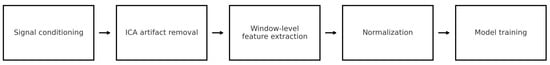 We applied FastICA with the number of components set equal to the number of EEG channels (14), ensuring a full-rank decomposition and maximal separation capacity. Components were marked for removal using a predefined decision rule based on (i) scalp maps, (ii) power spectral density, and (iii) time-course inspection for event-locked or burst-like artifacts. Signals were subsequently re-referenced to the common average to reduce bias from any single electrode. In line with recent evidence that ICA-based artifact removal does not universally improve downstream decoding, particularly in deep models or when artifacts are weak or nonstationary, we applied removals conservatively and only to components meeting strict criteria [32,33].