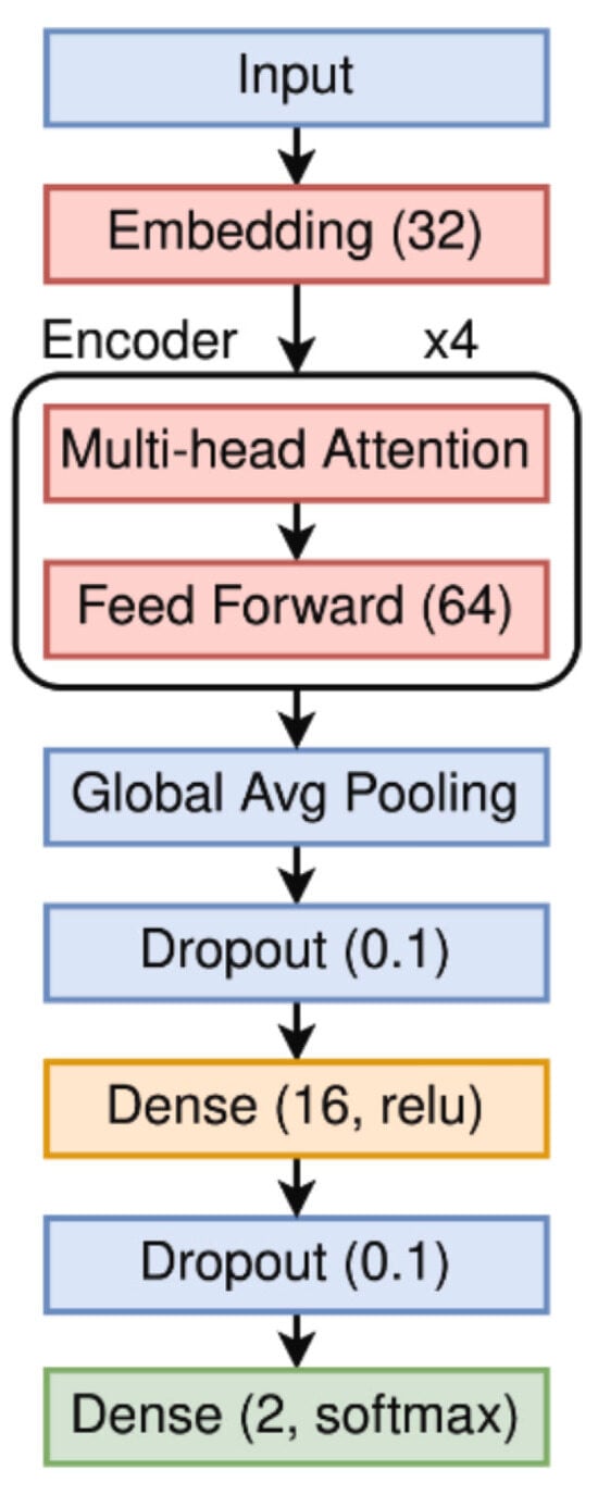 In our implementation (Figure 3), the model begins with an embedding layer projecting the 13-dimensional feature vectors into a 32-dimensional space, followed by a multi-head attention module with four heads and key dimensions of 32, and a point-wise feed-forward network of width 64 with ReLU activations. Dropout (rate 0.1) was applied after attention and feed-forward layers to prevent overfitting. We trained the network using Adam (learning rate ) and categorical cross-entropy loss for up to 100 epochs with early stopping (patience 10), following hyperparameter settings validated in EEG transformer studies [41].