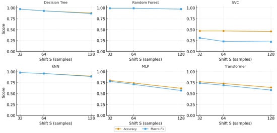 Figure 4 plots accuracy (left) and macro-F1 (right) as a function of temporal shift S for each of the six models (one panel per model). Across models, both accuracy and macro-F1 improve as the shift decreases from 1.00 s to 0.25 s. The trend is visible for all six classifiers and is monotonic in most cases. This pattern is consistent with the change in effective sample count introduced by S (Section 3.3): at fixed L and recording duration, reducing S increases the number of windows per recording (from 147 at to 585 at ), and therefore increases the number of training and test examples used by the models. Because windows created with small S share a large portion of samples, the additional examples are temporally denser rather than independent, but they still yield higher aggregate scores on the held-out test set.