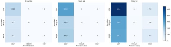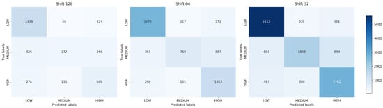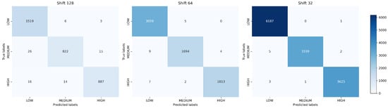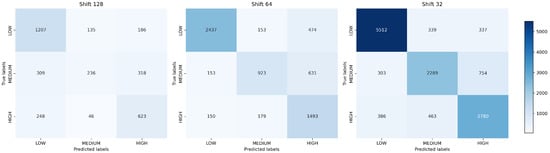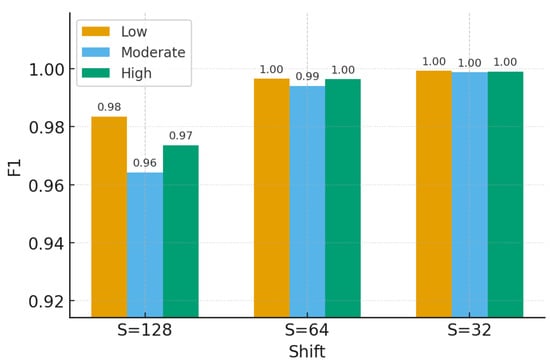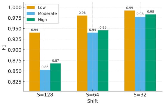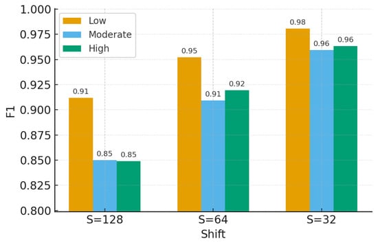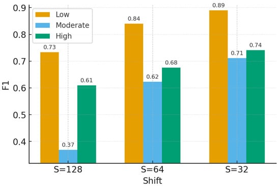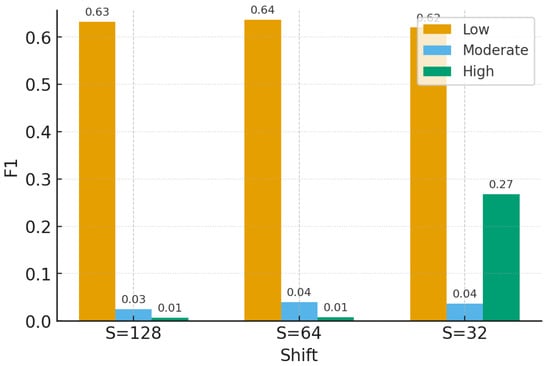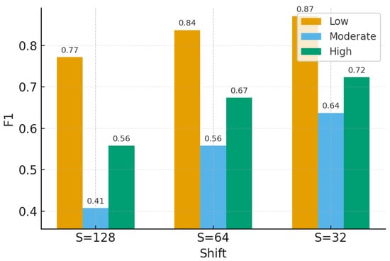 With a fixed window length, the temporal shift S determines both the overlap between adjacent windows and how many windows are produced from the same recording (see Section 3.3). On the held-out test split, the total number of windows grows from 3308 at to 6593 at and to 13,163 at . Class totals scale accordingly: low , moderate , and high . Thus, halving S approximately doubles the number of available windows while leaving the class mix essentially unchanged.