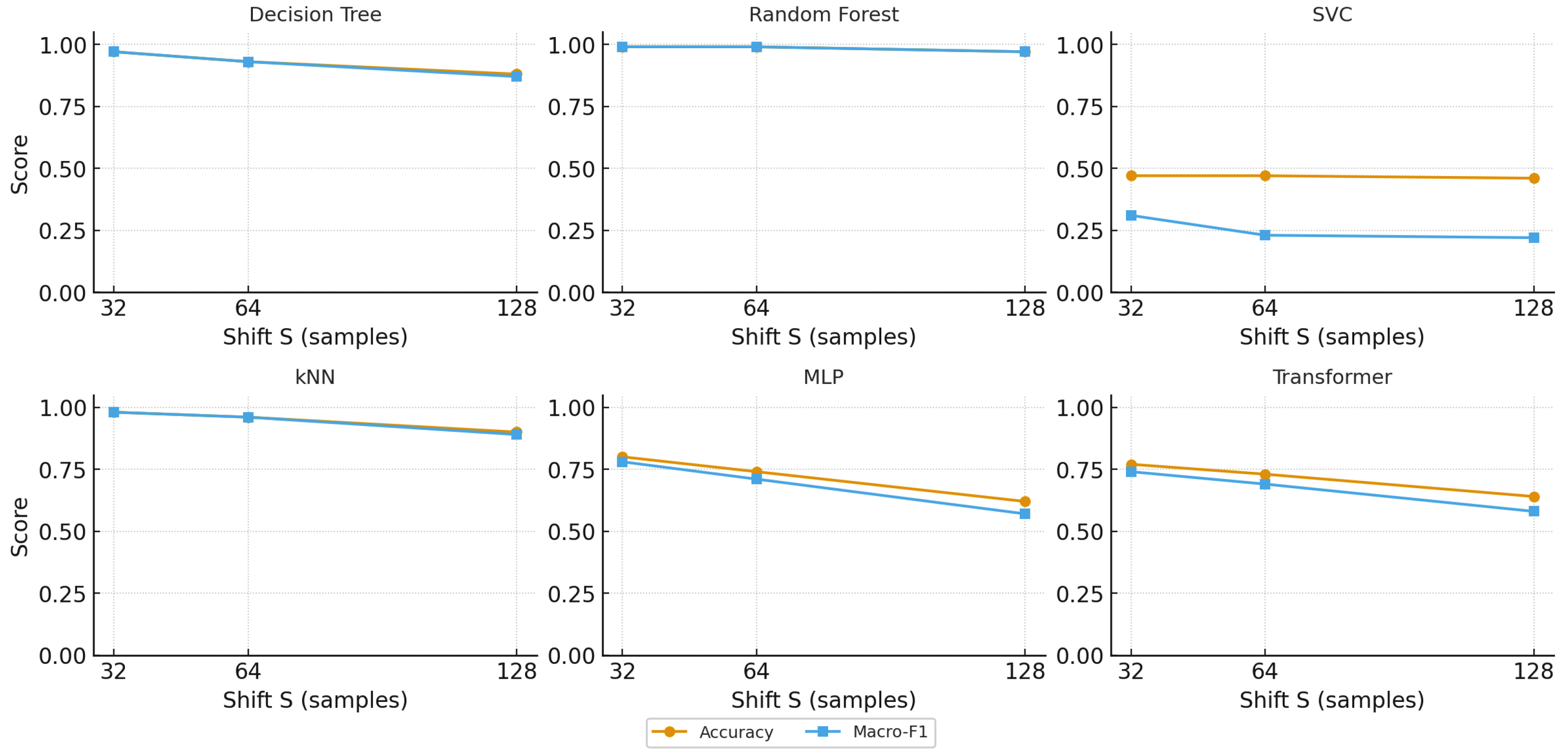 - Shift–performance sensitivity: When the window length is fixed, how does varying the temporal window shift influence overall accuracy and macro-F1 across the six models considered?