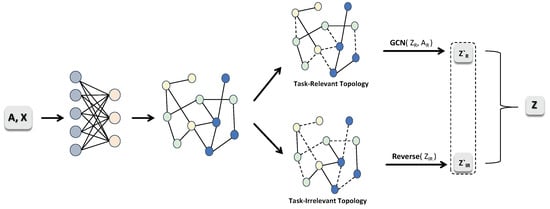 Disentangled representation learning aims to learn interpretable and independent representations, where each dimension or subspace corresponds to a distinct factor of the data []. In recent years, disentangled representation learning has been increasingly applied to GNNs to address graph-related tasks. For example, IPGDN enhances model performance by promoting independence among decomposition factors and integrating global graph information []. DisenGCN introduces a neighborhood routing mechanism that iteratively partitions each node’s neighborhood into different segments, thereby disentangling node information []. FactorGNN takes a generative perspective, decoupling node representations into multiple factor graphs to capture higher-order semantics []. IDGCL employs multi-channel disentangled modeling to accurately distinguish multiple independent factors in a graph, effectively improving interpretability in graph classification tasks []. It is worth noting that our model shares certain similarities with FactorGNN in that both decompose the original network topology into multiple subgraphs. However, there are fundamental differences between the two. First, FactorGNN merely partitions neighboring nodes into multiple semantic factors without explicitly modeling task relevance. Second, it allows an edge to belong to multiple subgraphs, which may lead to potential overlaps. In contrast, TRed-GNN adopts an edge-separation strategy to generate two complementary subgraphs representing task-relevant and task-irrelevant topologies. It then introduces a reverse process mechanism within the subgraphs to enhance classification capability and generalization.