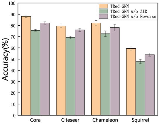 In addition, we include the variant “w/o ZIR”, which removes the dual-channel disentanglement and propagates messages over a single graph structure. As illustrated in the figure, “w/o ZIR” performs similarly to GCN in the shallow regime, but its accuracy stabilizes at a slightly higher level when the depth increases, showing that the reverse process can still alleviate part of the over-smoothing. However, compared with the full TRed-GNN, the gap is significant, especially on heterophilous datasets such as Chameleon and Squirrel, where dual-channel disentanglement is crucial. This clearly demonstrates that separating task-relevant and task-irrelevant edges plays an indispensable role in enhancing model robustness against over-smoothing.