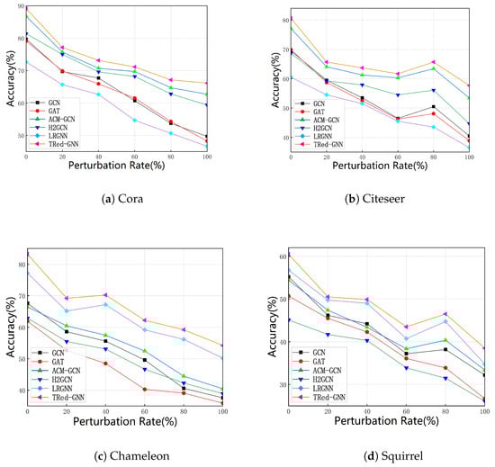 Results of different models on perturbed homophilous graphs. TRed-GNN exhibits superior robustness against disturbances compared to other models. The line charts display the accuracy of different models under varying levels of perturbed rates in (a) the Cora dataset, (b) the Citeseer dataset, (c) the Chameleon dataset, and (d) the Squirrel dataset. TRed-GNN is able to identify the falsely injected (the task-irrelevant) graph edges, and exclude these connections from the final predictive learning, thereby displaying relative robust performance against adversarial edge attacks.
