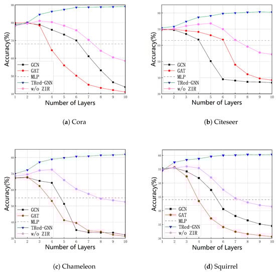 Accuracy comparison of GCN, GAT, MLP, TRed-GNN, and its variant w/o ZIR on four datasets ((a) Cora, (b) Citeseer, (c) Chameleon, and (d) Squirrel) as the number of layers increases, illustrating the impact of model depth on performance and over-smoothing.