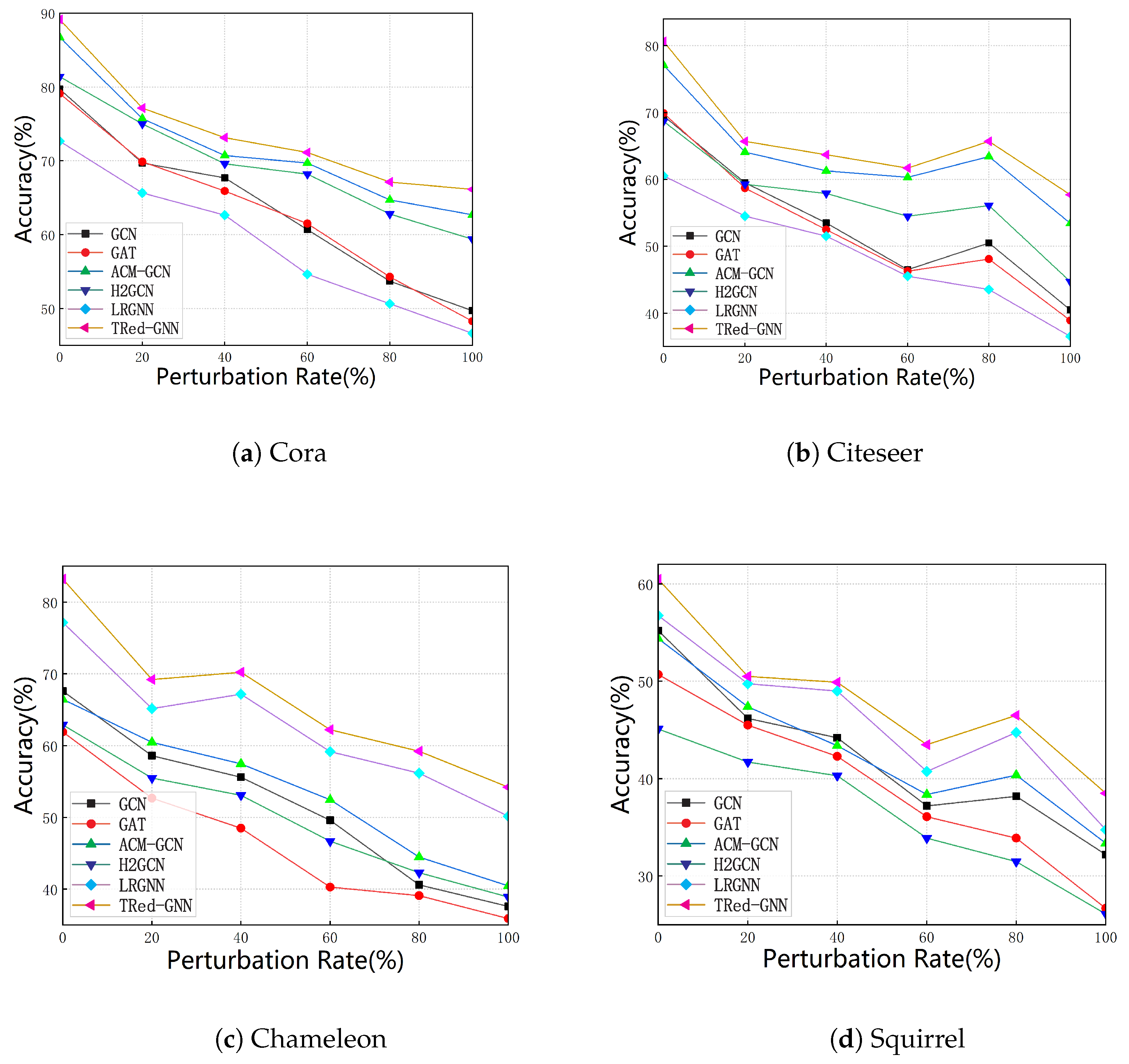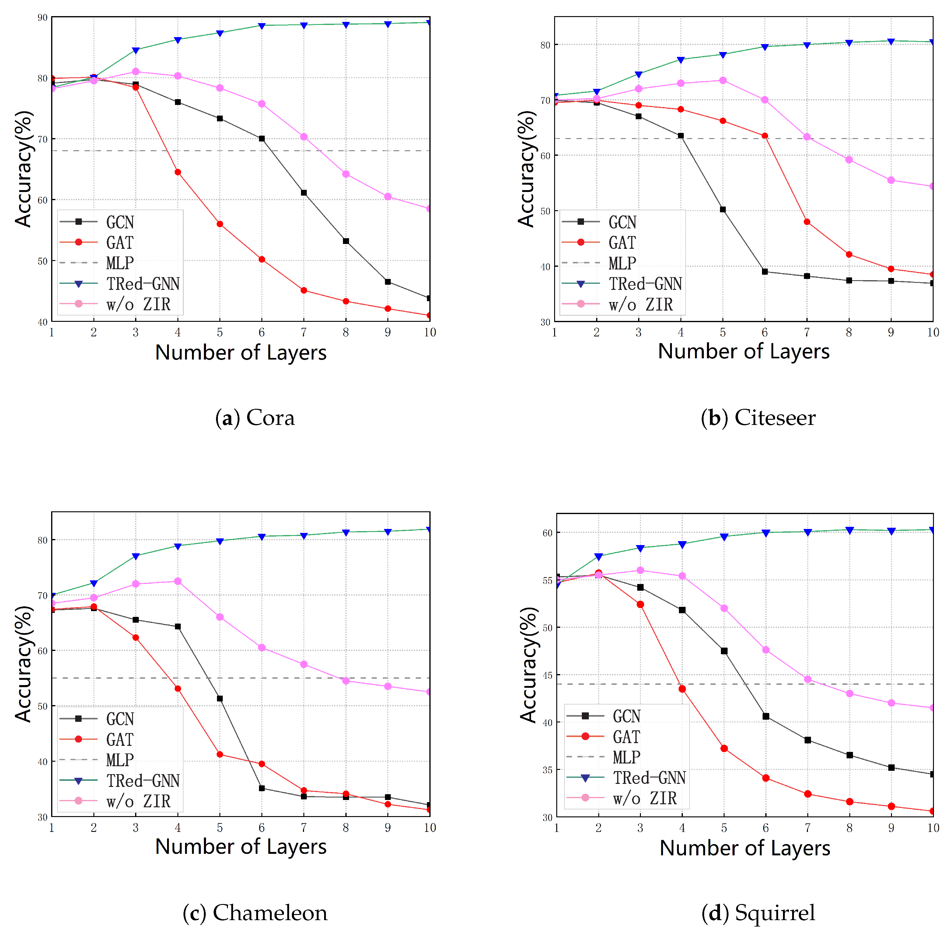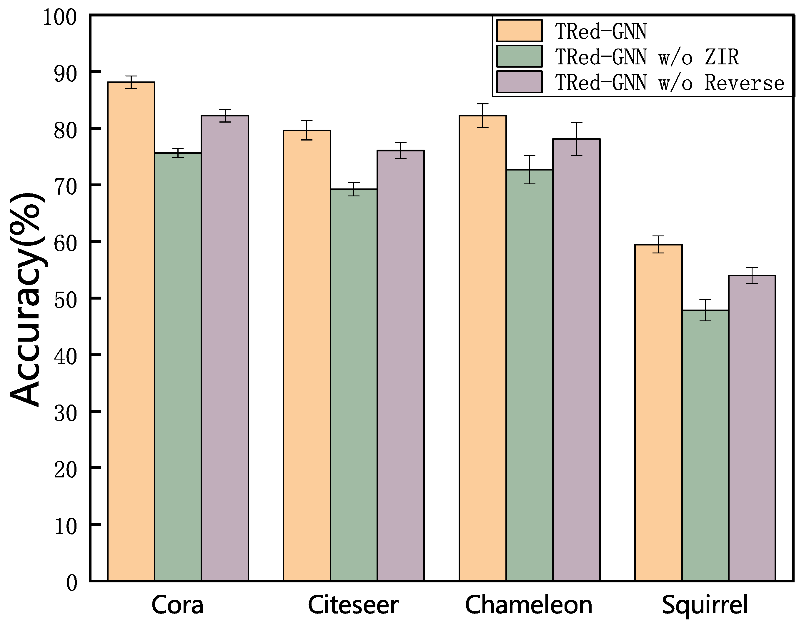 - We conducted systematic experiments on multiple real-world datasets (e.g., Cora, Citeseer, Chameleon) to evaluate TRed-GNN, demonstrating its superior performance over existing graph neural network methods across graphs with varying levels of homogeneity and heterogeneity.