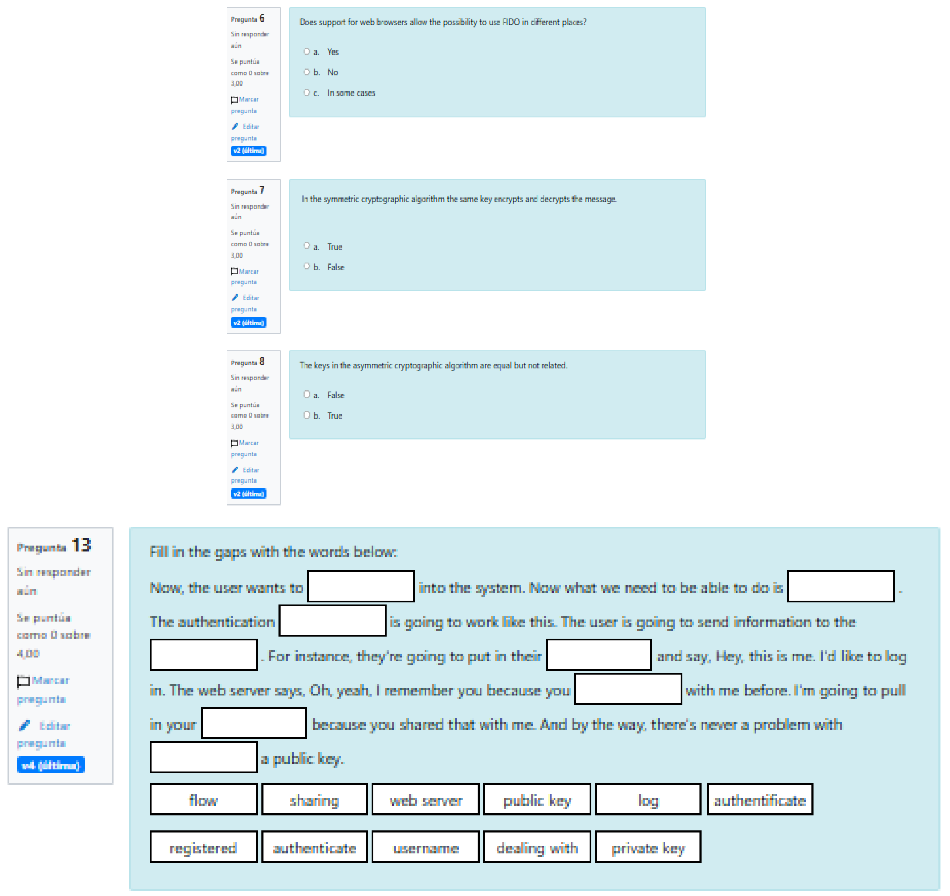 Figure 3 illustrates how this listening questionnaire on FIDO (Fast Identity Online) authentication, comprising multiple-choice (MCQ), multi-select MCQ, true/false, and fill-in-the-blank formats, effectively tracks students’ listening skills by requiring comprehension of audio-based content. Research demonstrates that MCQ formats in listening assessments measure comprehension by evaluating learners’ ability to process spoken information and select correct responses, highlighting how such formats diagnose barriers like vocabulary recognition and semantic understanding [