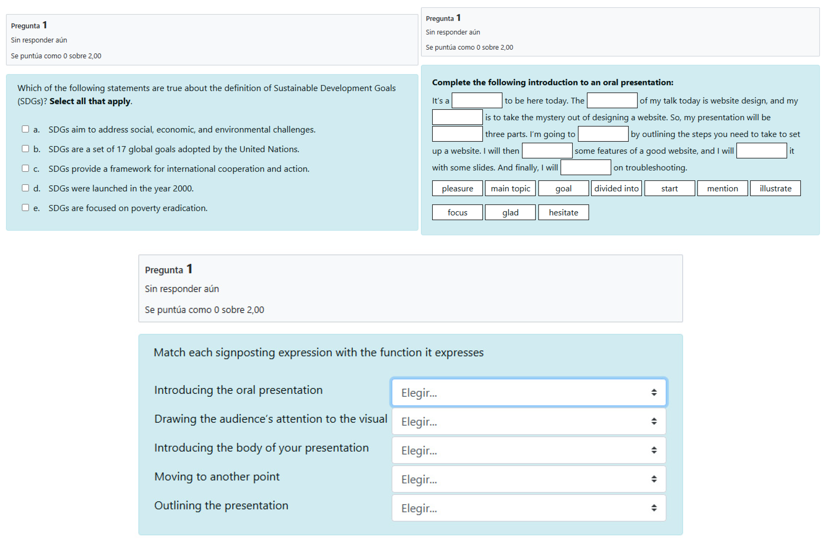 Questions focused on soft skills: short reading comprehension of reports regarding engineering, video visualization for listening comprehension on sustainability, debates on 2030 agenda’s SDGs (Based on IELTS reading part 1 and speaking part 2 questions) and speaking practice experience with Elsa Speak.