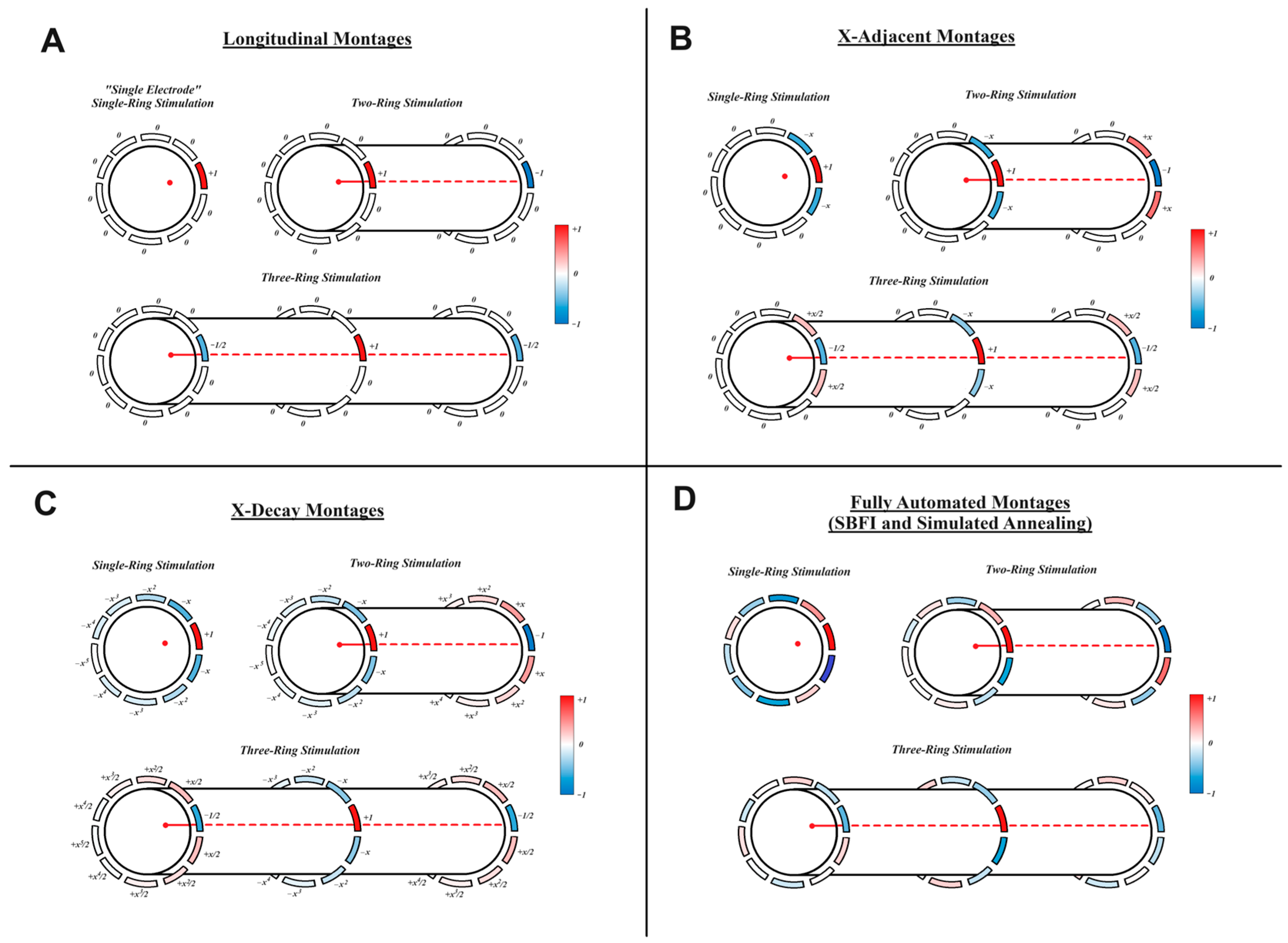 - “X-Decay”: X-decay montages are an extrapolation of X-adjacent montages, using all available electrodes. As shown in Figure 1C, each electrode farther away from a ring’s primary electrode will receive an additional power of X in its current calculation. Since X is a value between zero and one, electrodes farther away from the primary electrode receive less current. X-decay “X” values are calculated via simulated annealing in the same way as X-adjacent values. We are testing X-decay montages to observe the benefits and drawbacks of recruiting all possible electrodes, in comparison to the more straightforward X-Adjacent montages.
