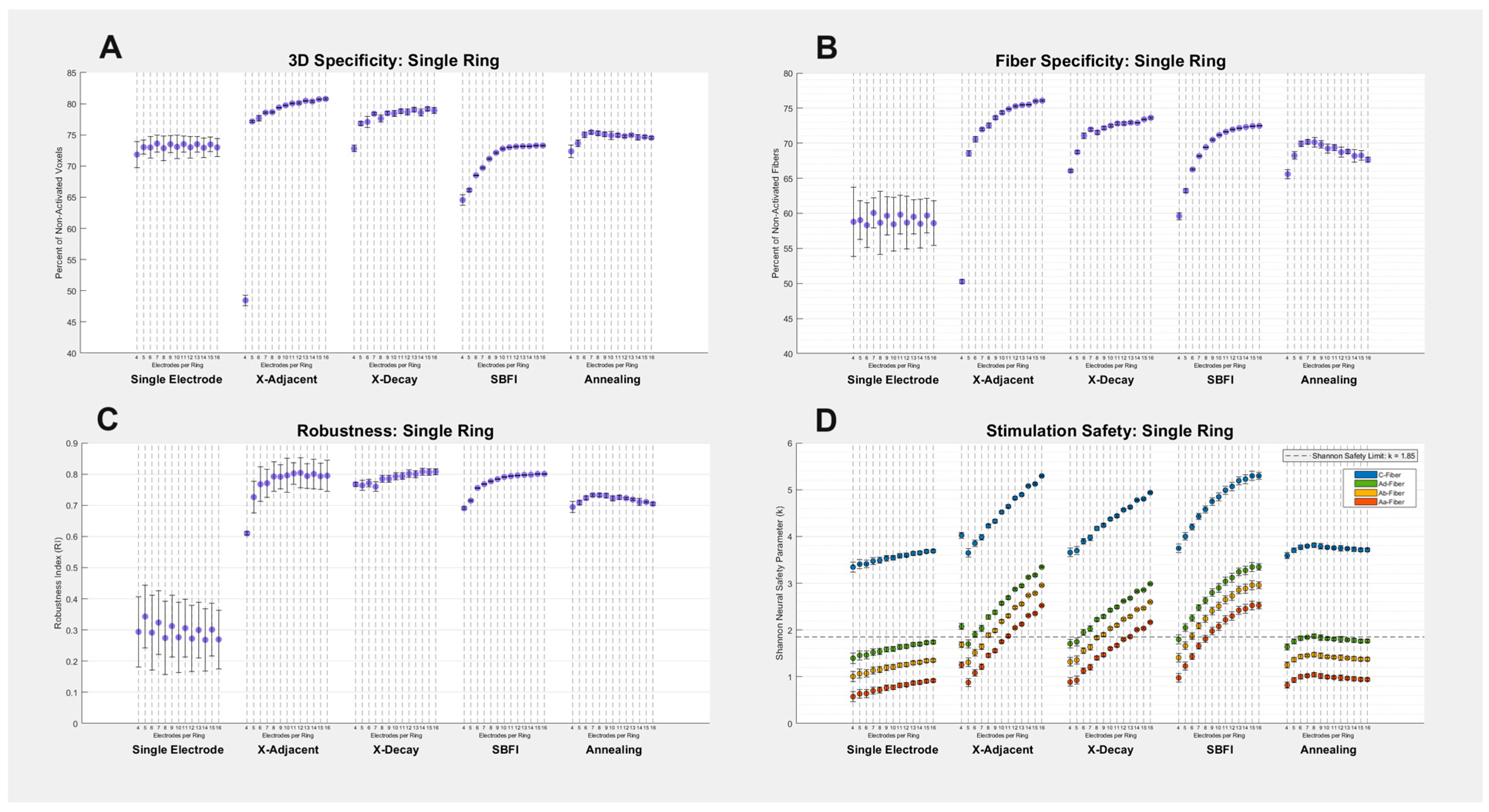 - Safety: Reusing the 2000 fibers from the fiber specificity test amplitude of current at each electrode required to achieve maximum specificity was recorded. The maximum charge density applied to each electrode was then found, and the stimulation was marked as unsafe if the maximum applied charge density resulted in a Shannon neural safety parameter exceeding k = 1.85 [36].