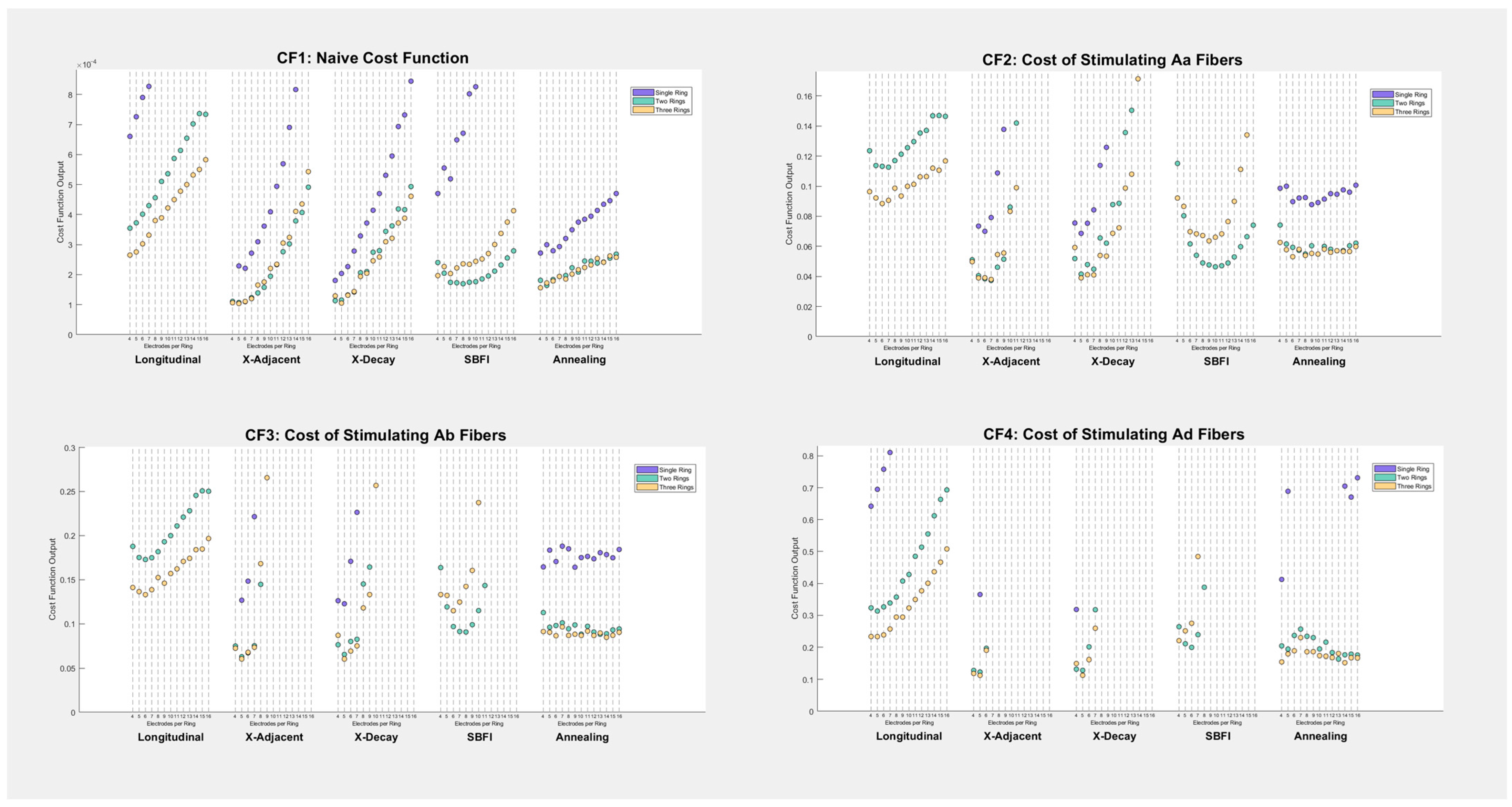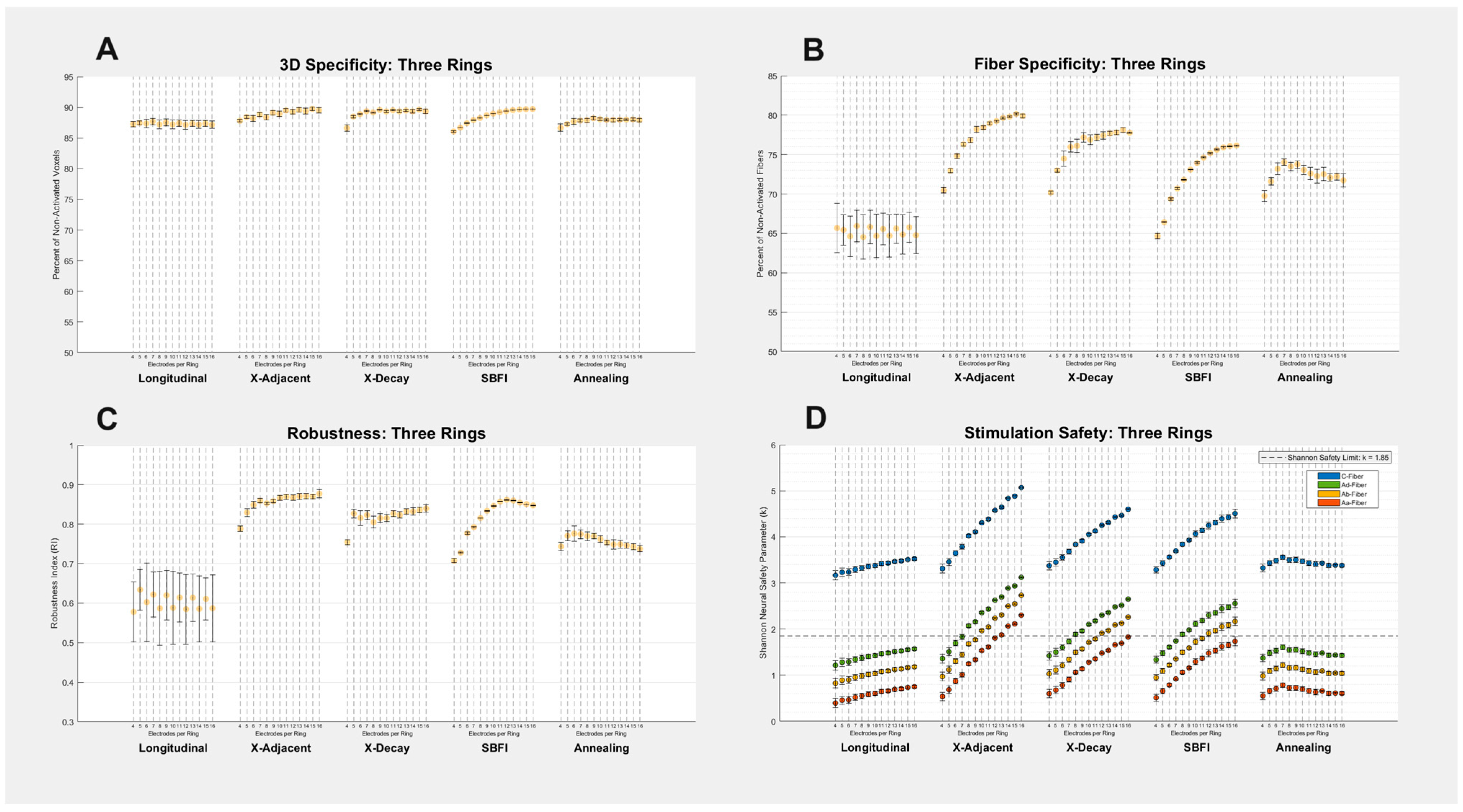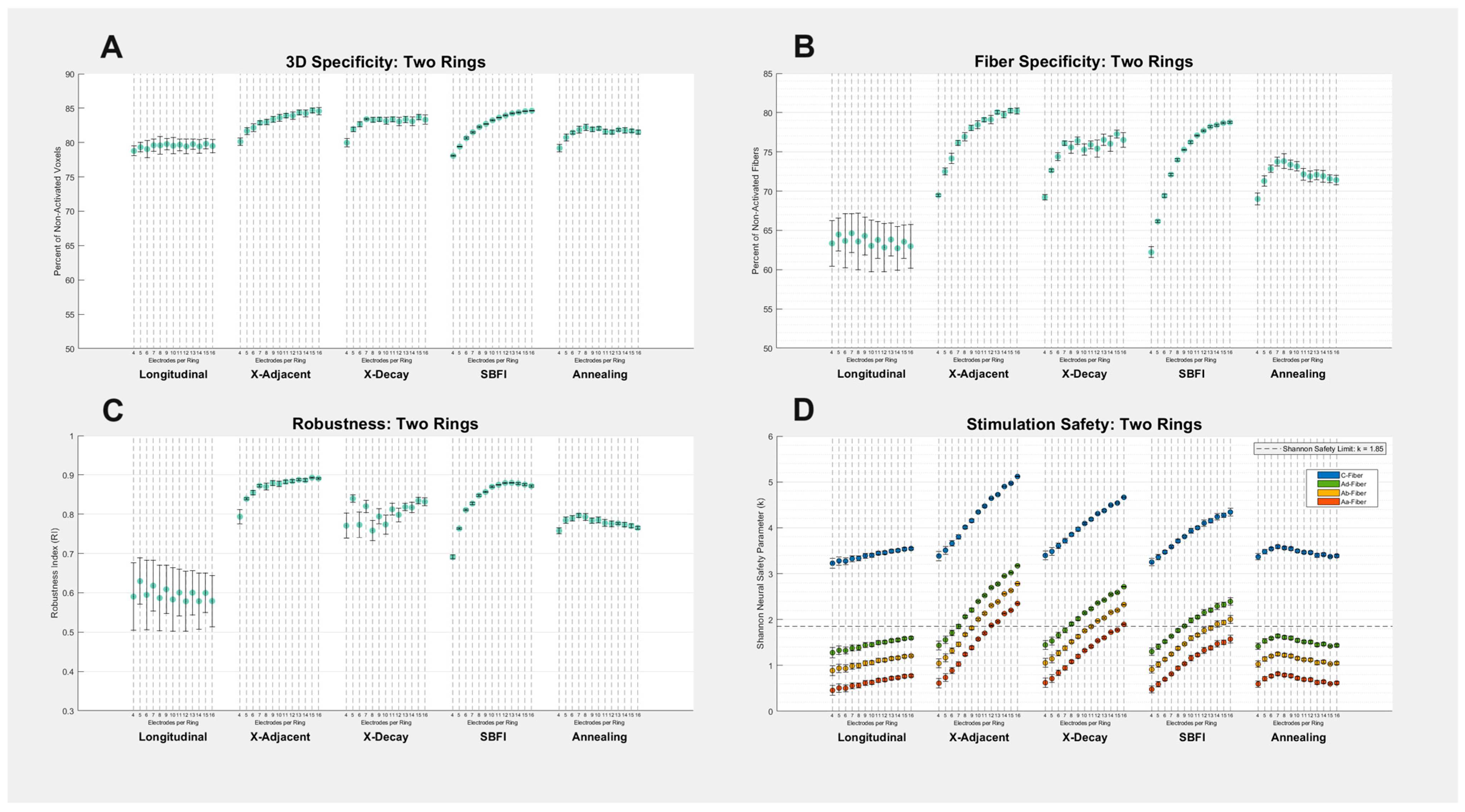 - “Simulated Annealing”: Prior studies, including [22,25], have used global optimization tools to find the optimal current applied to electrodes to achieve spatially selective stimulation. To compare global optimization to our other montages, we include a simulated annealing montage. This montage begins from the initial condition of the longitudinal stimulation, and simulated annealing is applied in order to maximize success at our “Fiber Specificity” metric (described in “Metrics of Success” below). Simulated annealing was performed in MATLAB with a tolerance of 10−6. To reduce the number of variables for multiple-ring configurations, the two-ring simulated annealing montages constrained current values of one ring to be equal and opposite of the other, and the three-ring simulated annealing montages were constrained such that the outer ring electrode currents were equal to −1/2 multiplied by the center ring electrode currents.