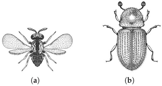 (a) Phymastichus coffea Lasalle (P. coffea). (b) Hypothenemus hampei Ferrari (H. hampei).