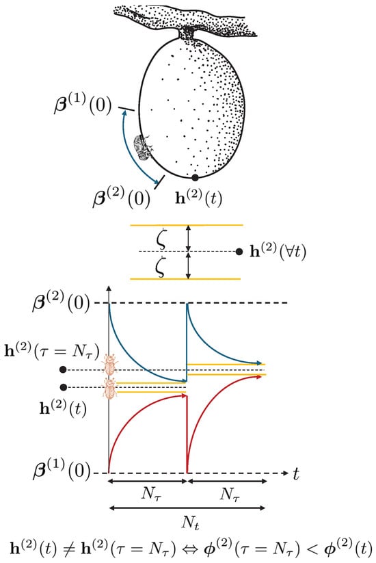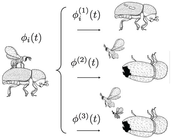 where  is the favorable parasitization event, when the wasp parasites the beetle;  implies the birth of only a female; and  corresponds to the birth of a female and a male. Note that types 2 and 3 affect the entire population; however, type 1 is particular for each agent, and this is reflected in the subscript i for this type of symbiotic relationship. A single male fertilizes numerous females; however, it requires a female to bore the host abdomen in order to emerge, and therefore, the birth of a female and a male is the ideal scenario for the P. coffea species [].