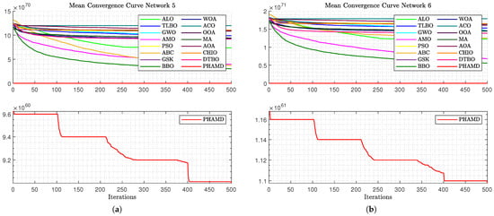 The performance of PHA-MD is compared with other heuristic optimization algorithms, such as Ant Lion Optimizer (ALO) [], Teaching–Learning-Based Optimization (TLBO) [], Grey Wolf Optimizer (GWO) [], Animal Migration Optimization (AMO) [], Particle Swarm Optimization (PSO) [], Artificial Bee Colony (ABC) [], Gaining–Sharing Knowledge Based Algorithm (GSK) [], Biogeography-Based Optimization (BBO) [], Whale Optimization Algorithm (WOA) [], Ant Colony Optimization (ACO) [], Osprey Optimization Algorithm (OOA) [], Mayfly Algorithm (MA) [], Archimedes Optimization Algorithm (AOA) [], Coronavirus Herd Immunity Optimizer (CHIO) [], and Driving Training-Based Optimization (DTBO) [].