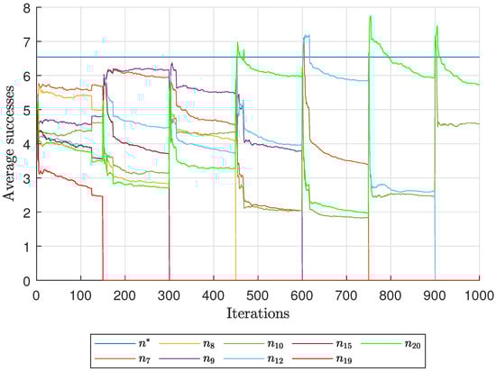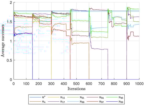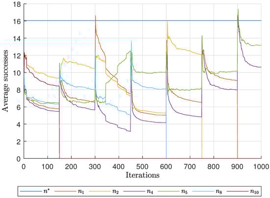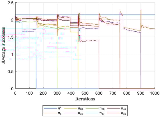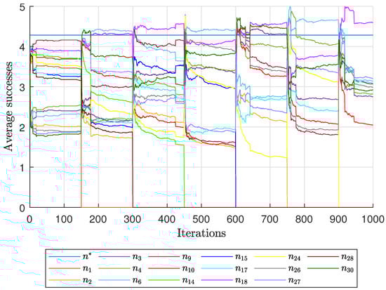 Blocked and excluded nodes for Network 3. Owing to the network topology and initial conditions, this case requires fewer pinning nodes than Network 2 for stabilization. Between iterations 900 and 1000, the excluded node  appears above the threshold  due to randomness and the local/global influence coefficients of the agents.