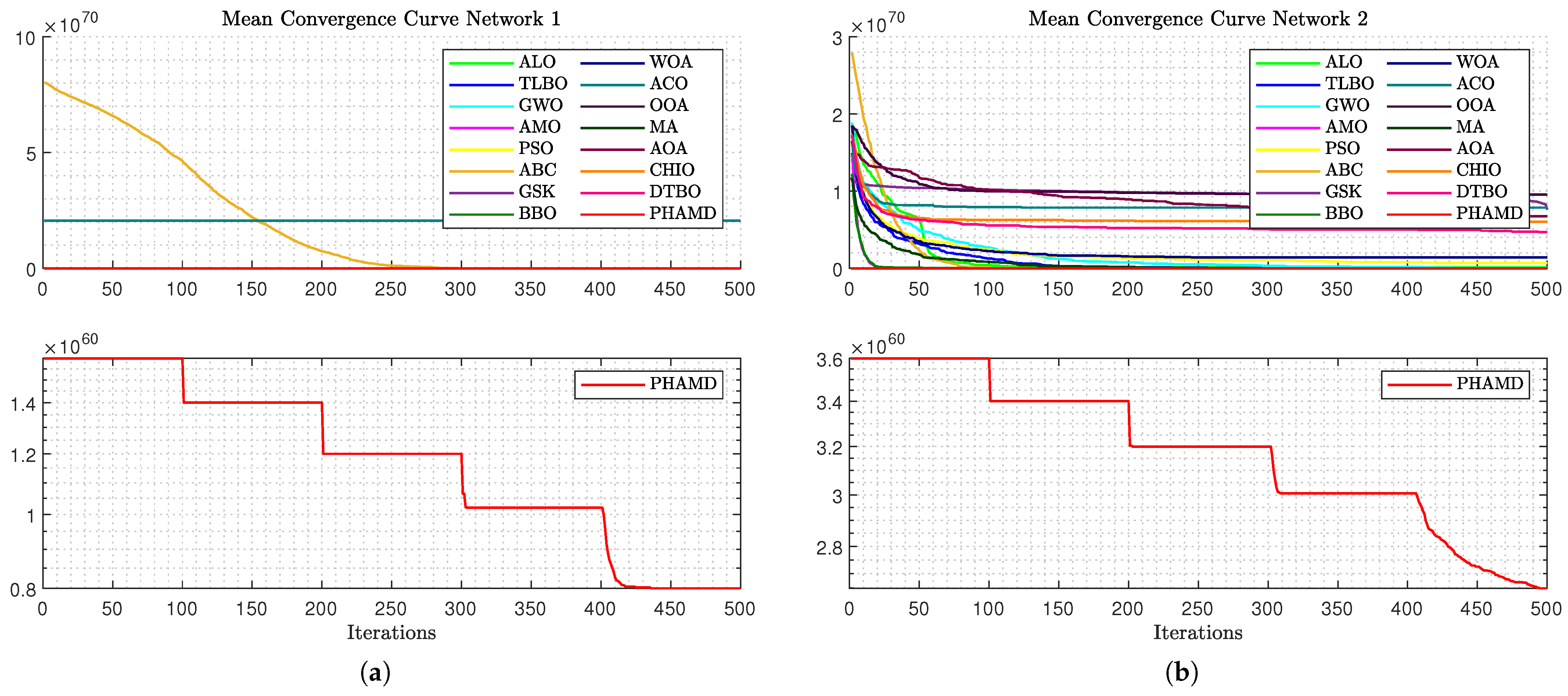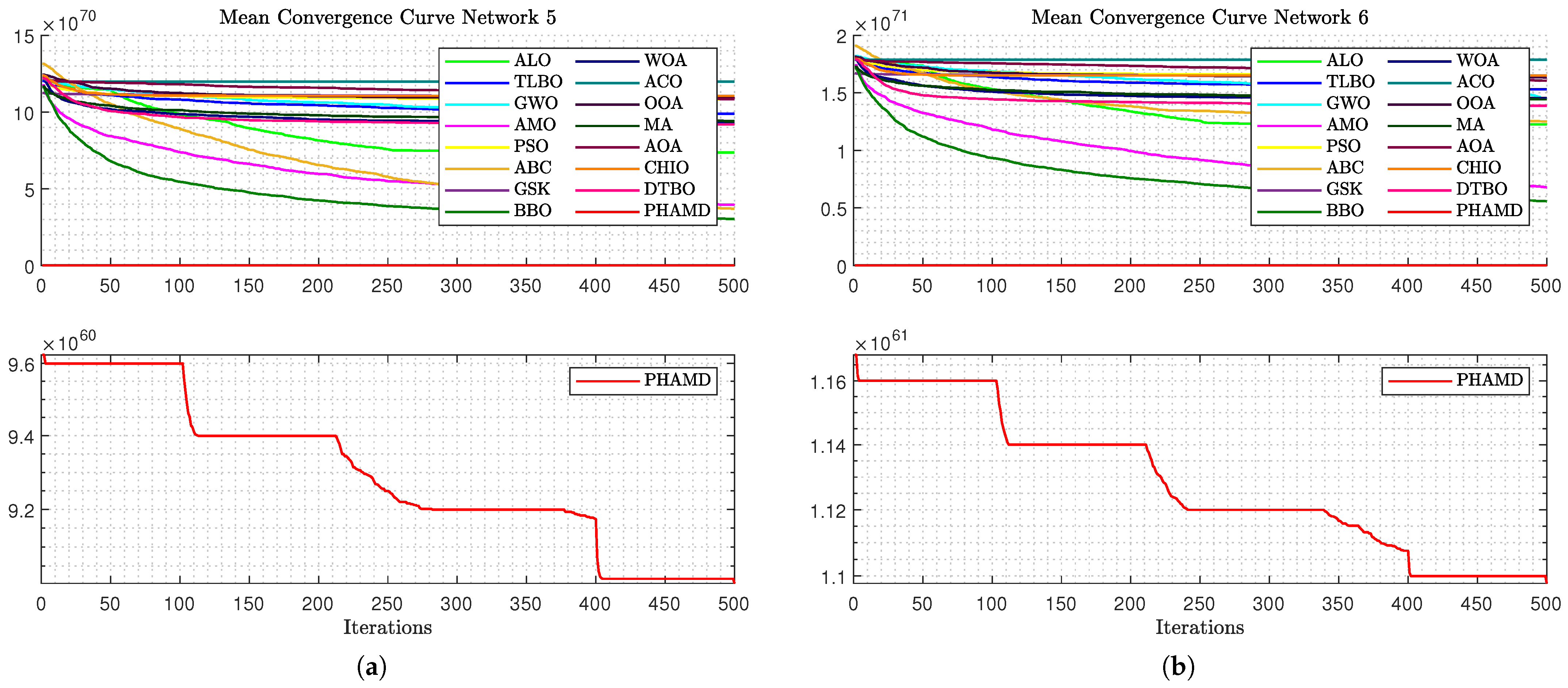 Figure 13) presents the convergence curves for each network’s optimization, comparing the performance of the PHA-MD algorithm with that of other algorithms. The second set (
