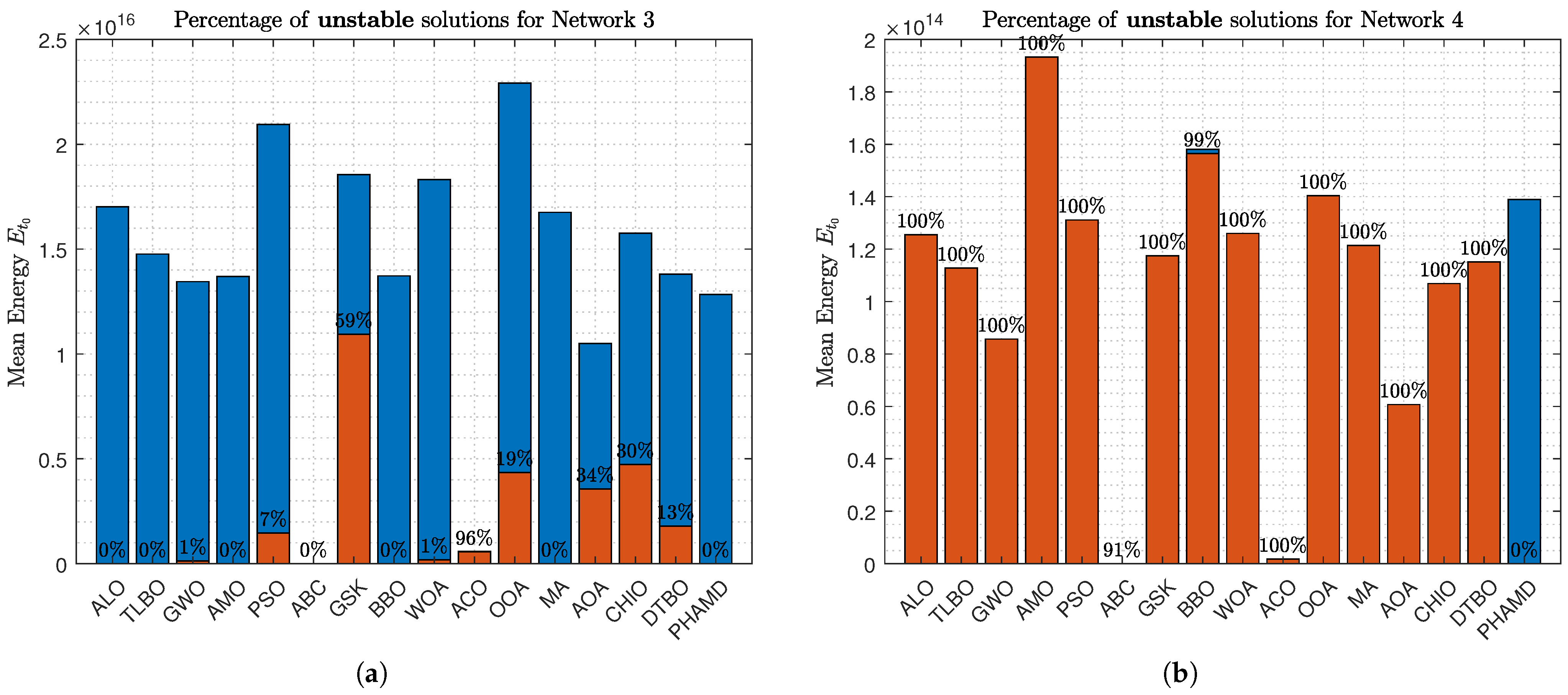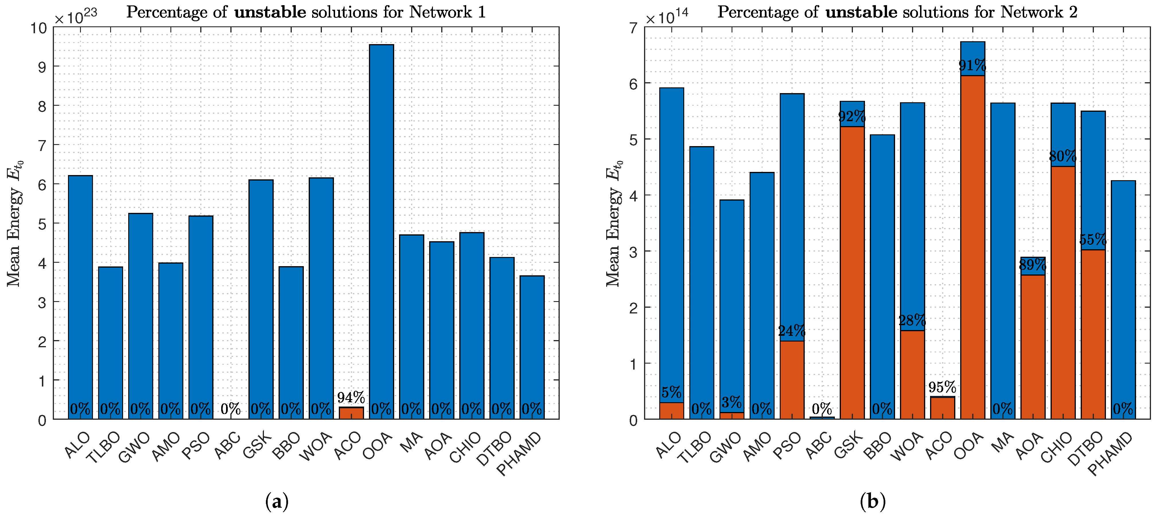 Figure 14b, the ABC algorithm remains the most energy-efficient, but several algorithms, including ALO, GWO, PSO, WOA, GSK, and ACO, present unstable solutions, with ACO having the highest instability rate at 95%.