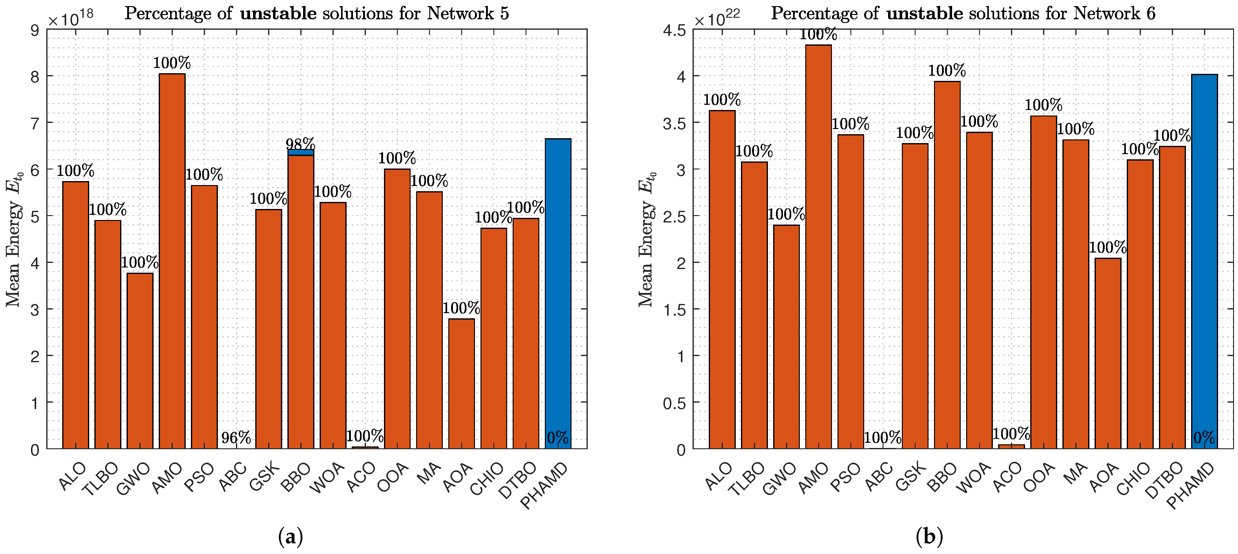 Figure 16b highlights that only PHA-MD provides stable solutions, underscoring its prioritization of stability over energy efficiency.