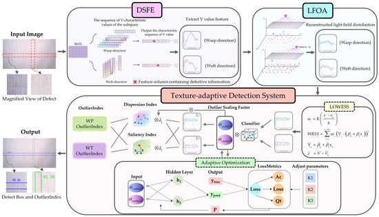 The proposed method, illustrated in Figure 1, systematically implements this principle through three key stages. First, a Dynamic Subspace Feature Extraction (DSFE) method is employed to capture the key textural and structural features from the fabric images. Second, to mitigate the influence of environmental variations, a Light Field Offset-Aware (LFOA) module is then used to correct for visual inconsistencies. Finally, a texture-adaptive defect system analyzes the corrected features to quantify potential defects. This is achieved by initially using Locally Weighted Regression (LOWESS) to localize luminance outliers. A multidimensional analysis is then performed on these outliers, integrating both saliency and dispersion metrics to form a comprehensive, probabilistic OutlierIndex. Crucially, this stage is made adaptive by an embedded optimization model, which automatically tunes the outlier scaling factor —a critical parameter in the detection process—a mechanism that allows for automatic adaptation to different fabric textures during defect detection.