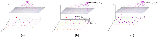 Schematic diagram of LFOA, darker colors indicate higher brightness values. (a) Schematic diagram of brightness distribution with only top light source illumination; (b) Schematic diagram of unified light field and compensation; (c) Schematic diagram of the reconstructed brightness distribution.