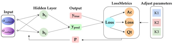 Based on the parameters , , and , combined with the real-time loss, loss change rate , and accumulated historical loss , the scaling factor deviation is calculated. This deviation , is then used to optimize the outlier scaling factor via a backpropagation algorithm. This process enhancing the overall accuracy and stability of the model (Equations (30)–(32)).