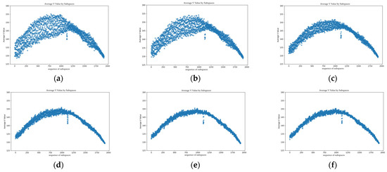 Let denote the brightness of the light; represent the total brightness of the light source; represent the distance from the light source to the center point of the fabric, and be the actual distance from the light source to the fabric. Since the brightness at the fabric center and the distance are known, the brightness of the light source can be determined (Equation (3)). Through Equations (7) and (8), the skewness of the data calculated, and the offset distance is determined using Equations (9) and (10). Similarly, the same applies to the y-direction. By adding these offsets to the pixel coordinates, we calculate the distance from the pixel to the center of the light source.
