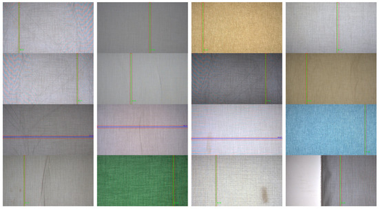 Figure 13 presents the annotation results for different fabrics and defect types. In the figure, red boxes denote the manually annotated ground truths, green boxes represent algorithm-detected warp-direction defects, and blue boxes indicate weft-direction defects, with the detection confidence displayed alongside each bounding box. As can be observed, our method precisely localizes the defects and demonstrates strong robustness, as its performance is not compromised by common industrial artifacts such as oil stains and wrinkles.