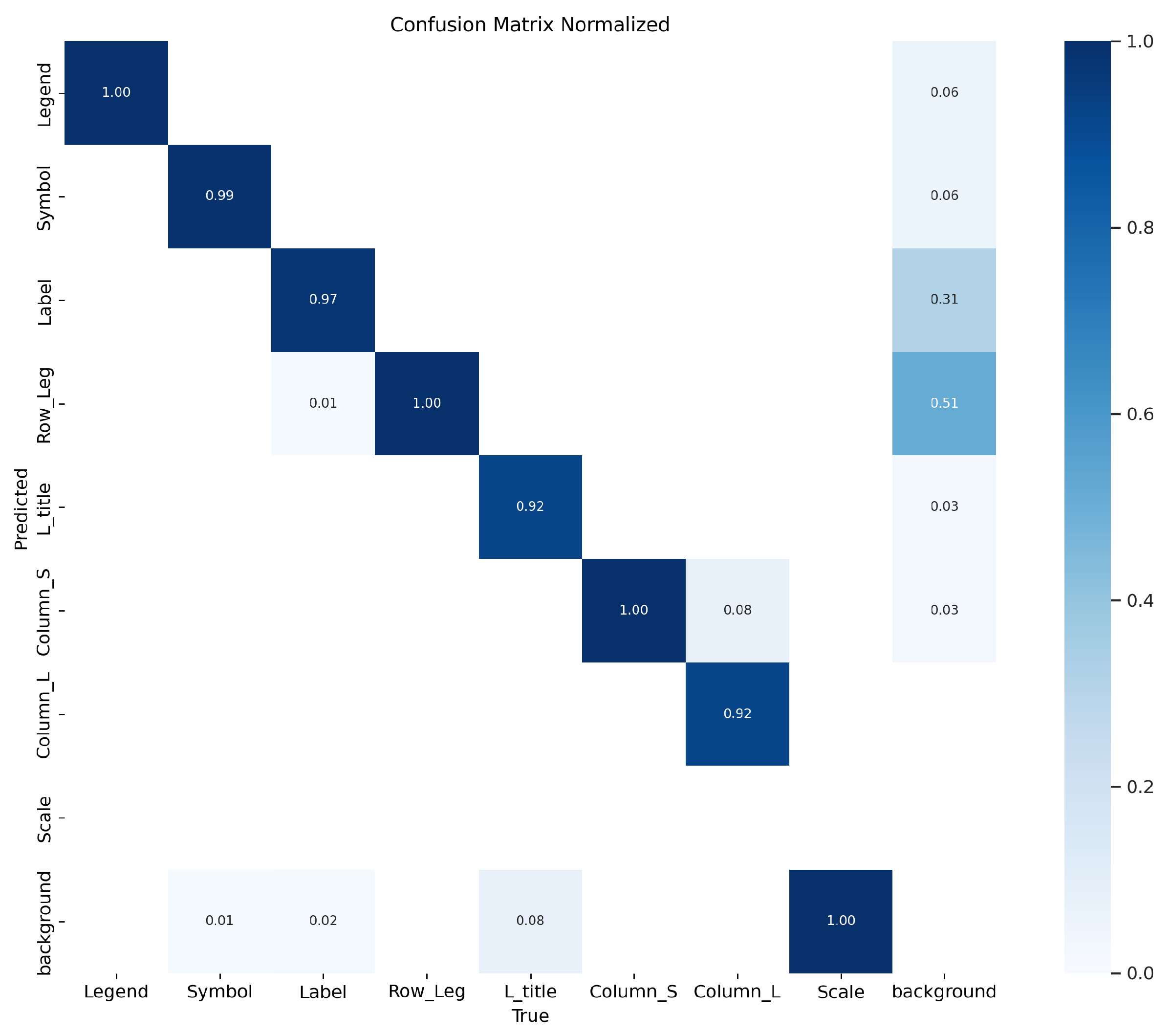 - Perfect Class Discrimination: The Legend, Symbol, Row_Leg, Column_S, and Scale classes achieve perfect classification accuracy (1.00 on diagonal);