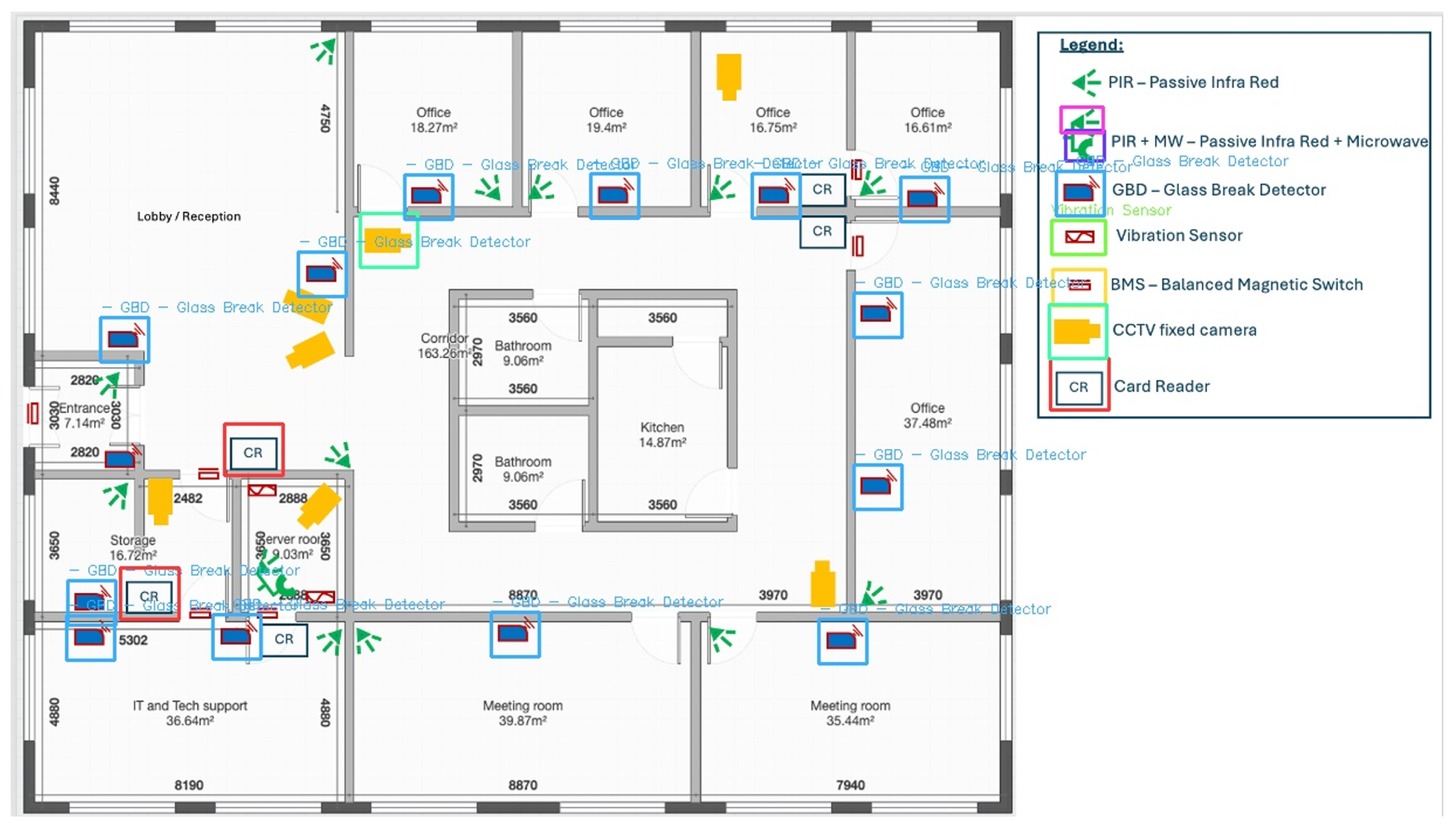 - Blue rectangle (SYM_005) → “GBD—Glass Break Detector”;