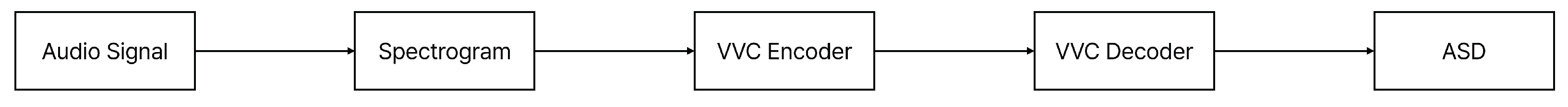 Figure 3 illustrates the VVC-based spectrogram compression pipeline. In this process, the spectrogram is treated as image data, enabling high compression efficiency; however, since the compression is optimized for human visual quality, fine-grained frequency patterns and boundary information critical for machine perception may be lost. Nevertheless, it serves as an important comparative baseline in this study, as it represents the upper bound of performance achievable with state-of-the-art video compression techniques.