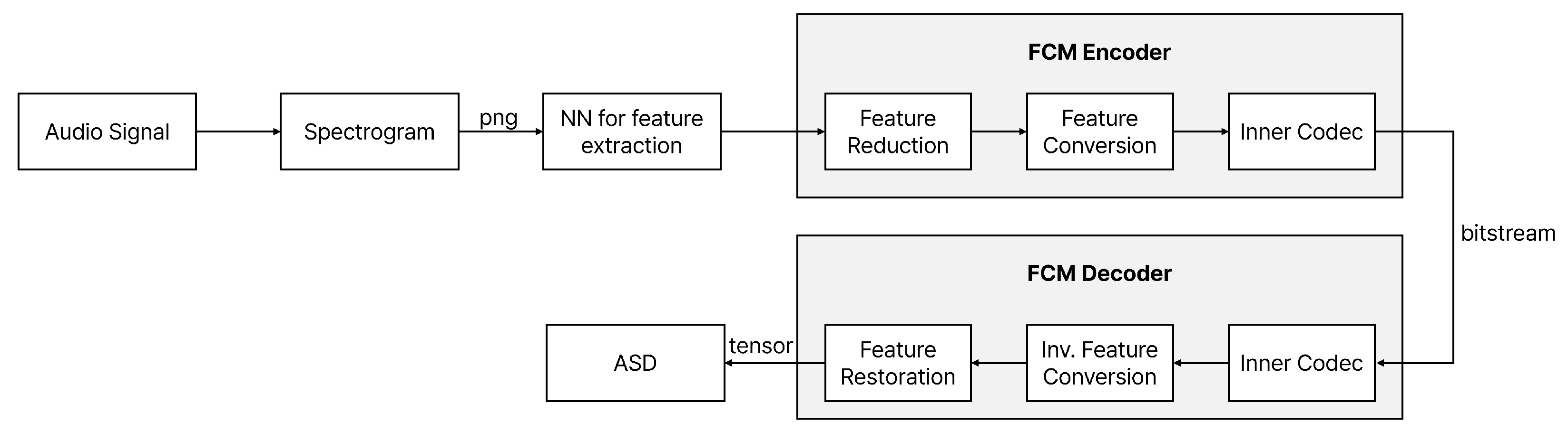 Therefore, conventional codecs such as AAC and VVC, while efficient for human perception, are not well-suited for machine listening tasks. This limitation highlights the need for machine-oriented codecs that can preserve subtle spectral cues essential for anomaly detection and other learning-based tasks. At present, however, there is no established codec in the audio domain specifically optimized for machines. Feature Coding for Machines (FCM) has been actively studied and standardized in the image and video domains as part of the VCM (Video Coding for Machines) framework, but its application to audio remains unexplored. In parallel, Audio Coding for Machines (ACoM) has only recently entered the standardization process. Importantly, the current stage of ACoM (Phase 1) is limited to near-lossless signal compression, while feature-level lossy coding is planned for Phase 2. This situation explains the scarcity of prior work in the audio domain and highlights the novelty of our study in addressing this gap.