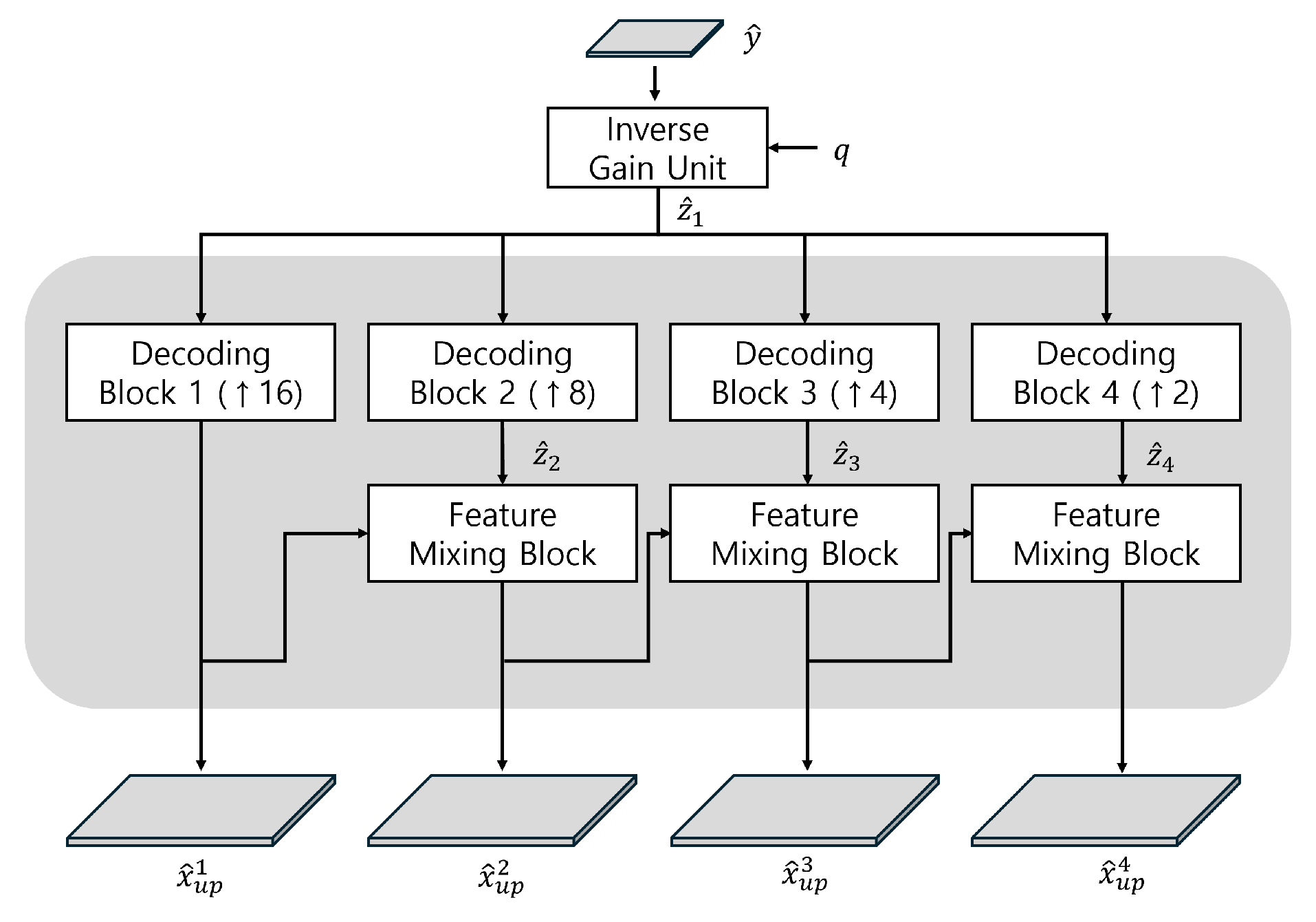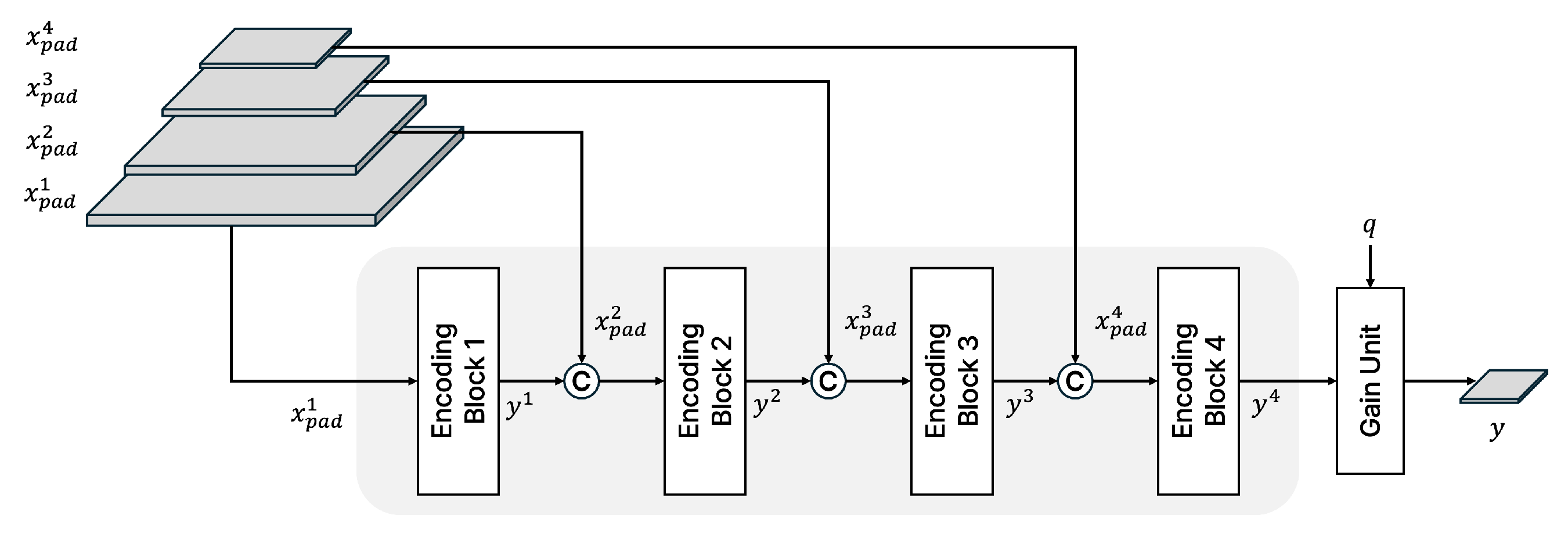 Figure 5, where four parallel encoding blocks complementarily fuse high- and loss-resolution information. The output of the final block is passed through a Gain Unit, where it is transformed into a latent vector prepared for quantization. In the subsequent Feature Conversion stage, the vector is packed into frames, normalized using min–max scaling, quantized into 10-bit integers, and then converted into the YUV format. Finally, in the Inner Codec stage, a VVC-based intra-mode codec is employed to generate the final bitstream.