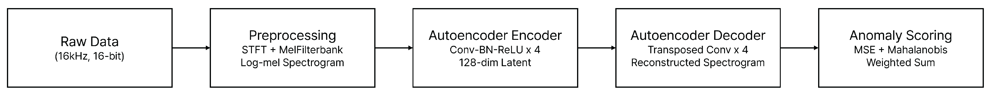Section 3 are applied to the actual anomaly detection pipeline, and the training procedures and experimental settings are detailed. The overall workflow of the proposed system consists of four stages: Raw audio input → Autoencoder → Anomaly scoring, as illustrated in