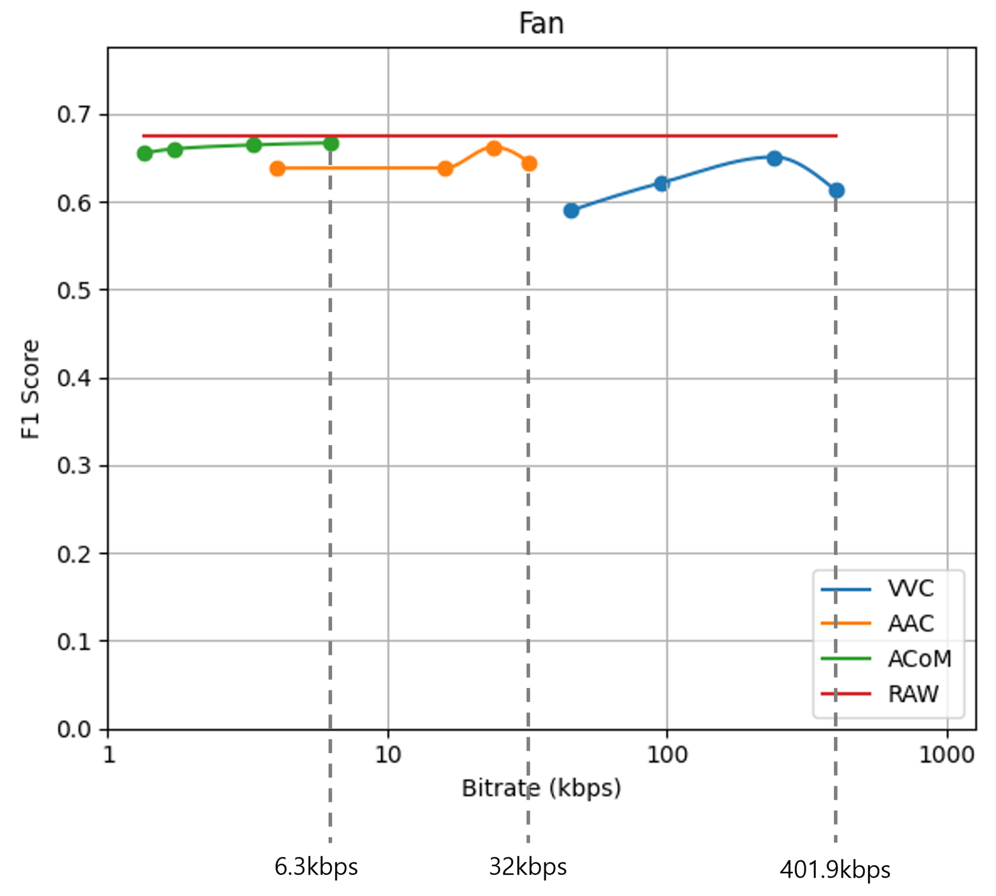 Table 2, the Raw data achieved an F1-score of 0.6754 for the Fan type. The proposed ACoM achieved an F1-score of 0.655 even at the lowest bitrate (1.3 kbps), outperforming AAC at 4 kbps (0.634). When the bitrate was increased to 1.7, 3.3, and 6.3 kbps, ACoM achieved an F1-score of 0.660, 0.664 and 0.667, respectively, approaching the performance level of the Raw data. This indicates that critical anomaly patterns can be preserved even under extremely low-bitrate conditions. In contrast, AAC achieved an F1-score of 0.634 at 4 kbps, confirming that its performance degrades at lower bitrates compared to higher ones. VVC achieved an F1-score of 0.613 at 401.9 kbps and 0.621 at 95.5 kbps, both lower than the Raw baseline even at high bitrates. In particular, at 45.4 kbps, performance dropped markedly, with an F1-score of 0.590.