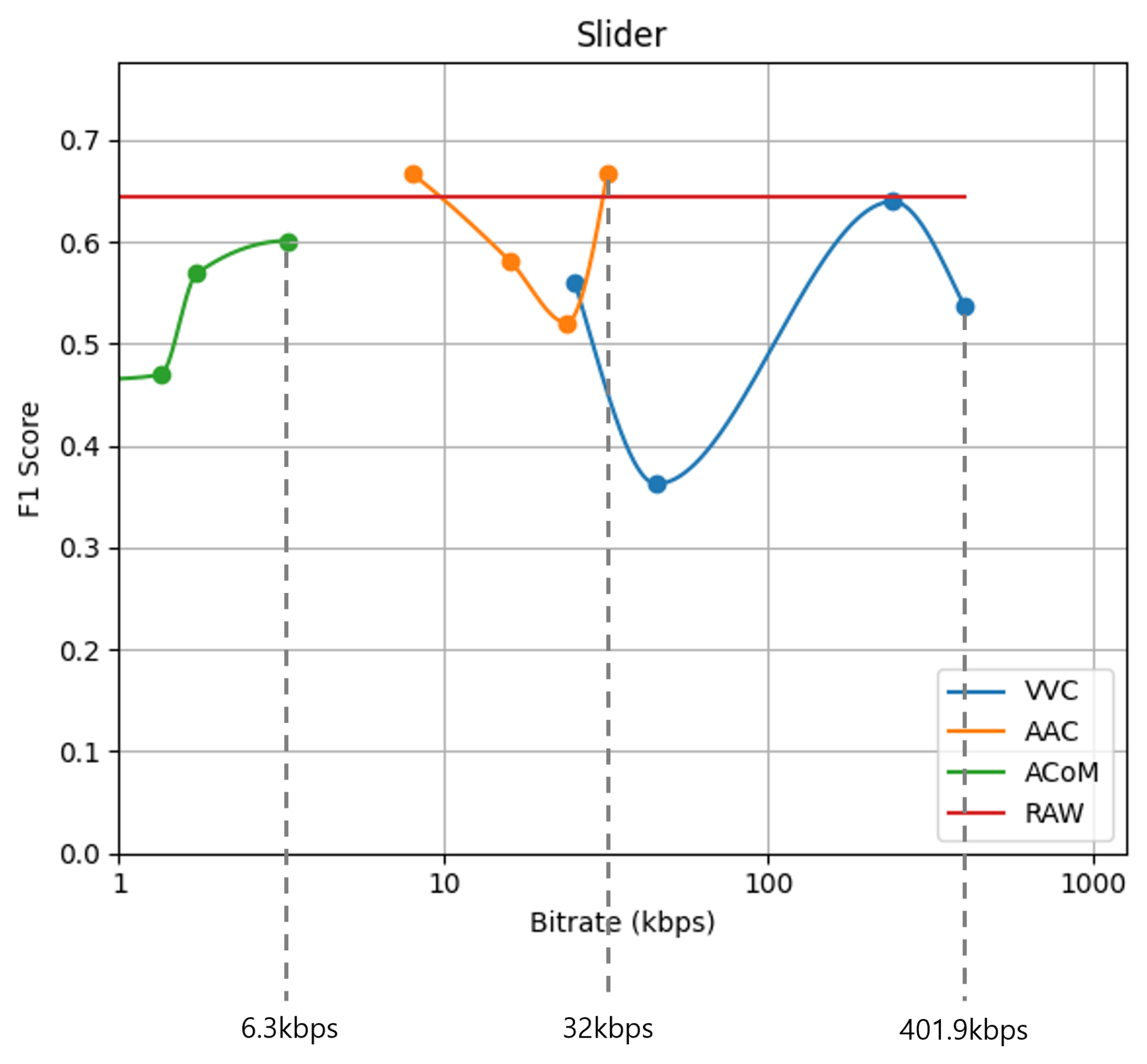 Figure 9, the Raw input achieved an F1-score of 0.6654, while ACoM reached an identical score of 0.667 at 6.3 kbps. Even at lower bitrates of 3.3, 1.7 and 1.3 kbps, ACoM achieved F1-scores of 0.654, 0.592 and 0.571, respectively, thereby maintaining a reasonable level of performance under low-bitrate conditions. AAC achieved its highest performance of 0.667 at 16 kbps, whereas at the lower bitrate of 4 kbps, its performance dropped to 0.641. VVC achieved an F1-score of 0.664 at 401.9 kbps, nearly matching the Raw input, but its performance dropped to 0.557 at 95.5 kbps, indicating that it remains competitive primarily in high-bitrate settings.