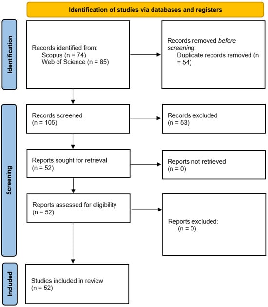 For the development of this systematic review, two databases were selected: Scopus and Web of Science. These platforms rank among the main sources for bibliographic analysis due to their multidisciplinary coverage and the availability of specialized indexes that ensure precision, transparency, and control over the retrieved information []. Figure 1 presents the PRISMA 2020 flow diagram, which summarizes the study selection process. A total of 159 records were identified from Scopus and Web of Science. After removing 54 duplicates using Rayyan, 105 records remained for screening. At the title and abstract screening stage, 43 records were excluded for not meeting the eligibility criteria. A total of 62 articles were retrieved in full text for eligibility assessment; however, 10 of them could not be accessed despite attempts through institutional libraries and direct author contact. As a result, 52 studies were effectively analyzed in the final review. No additional records were excluded at this stage, resulting in 52 studies included in the final review. The PRISMA checklist can be found in Table S1 of the Supplementary Material.