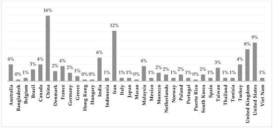 The scientific output on the topic shows a notable geographical distribution, as illustrated in Figure 2. China stands out as the leading research hub, accounting for 16% of the published articles, followed by Iran with 12%. The United States, the United Kingdom, and India also rank among the most productive countries, although with slightly lower shares compared to the two leaders. This scenario indicates that, in certain nations, the topic has already become a significant concern in the academic agenda. Conversely, countries such as Brazil, Australia, Denmark, and others still show relatively modest publication levels, highlighting both opportunities and the need to foster research in these contexts.
