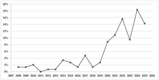 Regarding the temporal distribution, there has been a significant increase in the number of publications over the years, as illustrated in Figure 3. This growth has been particularly pronounced since 2020, reflecting the emerging nature of the topic. The year 2024 recorded the highest volume of works to date, marking a peak in research activity.