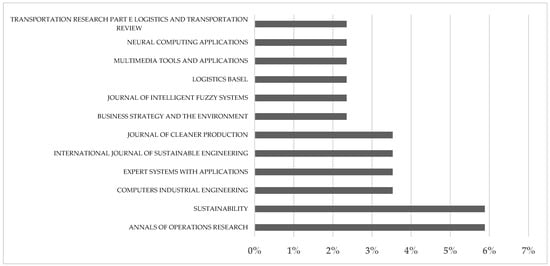 Regarding journals, as shown in Figure 4, Annals of Operations Research stands out, followed by Sustainability. Other journals also show relevant publication numbers, although to a lesser extent. Additionally, there is a considerable group of journals that contributed only one article each, indicating the dispersion of the topic across different fields of knowledge. It is also noteworthy that the most representative journals focus on both computing and sustainability, highlighting the interdisciplinary nature and the intersection between technology and environmental issues that underpin the discussion of ML applied to RL.